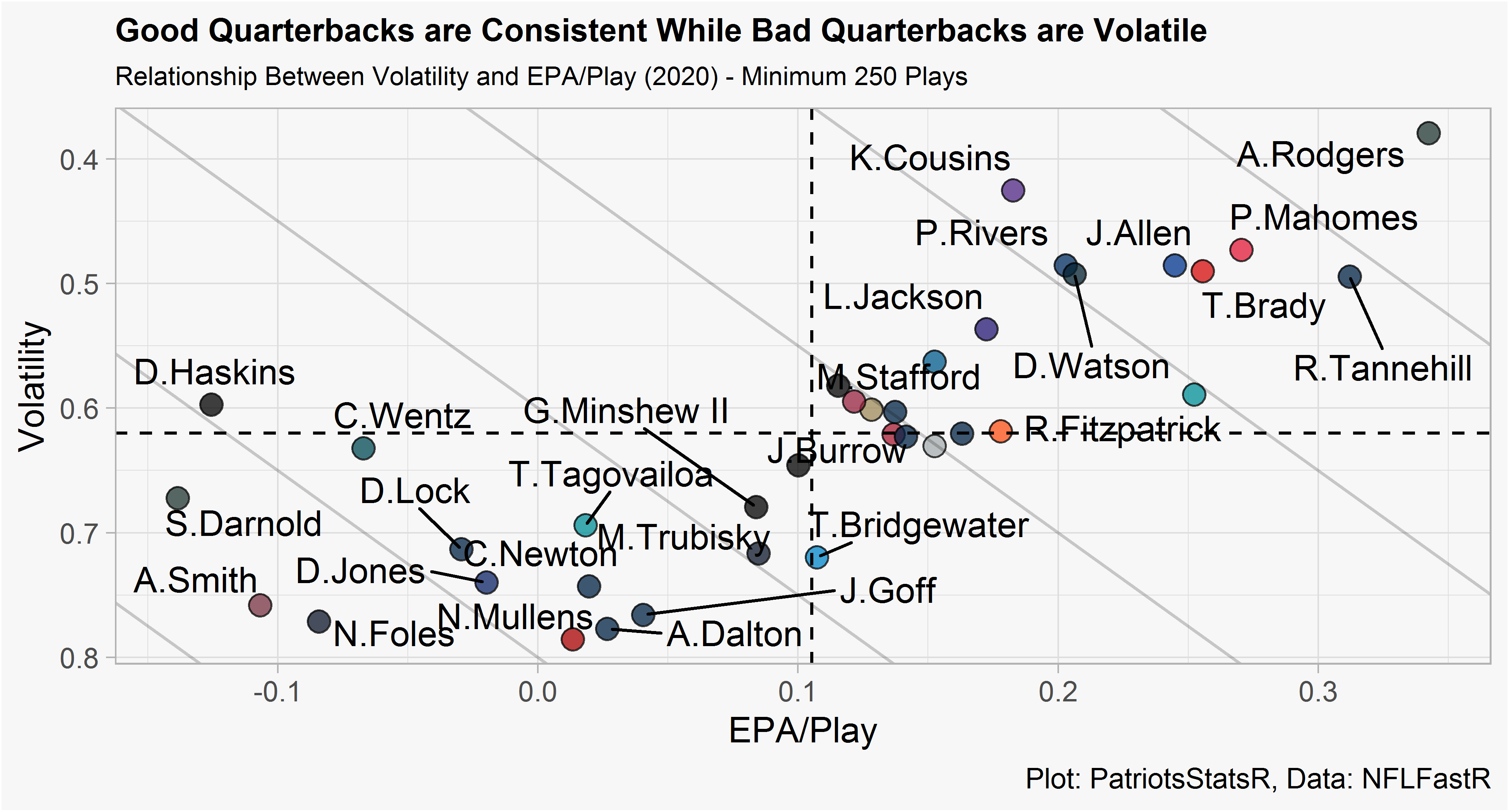 Analyzing how volatile individual QB seasons are with gini coefficients and a volatility over expected (VOLoe) GAM model.