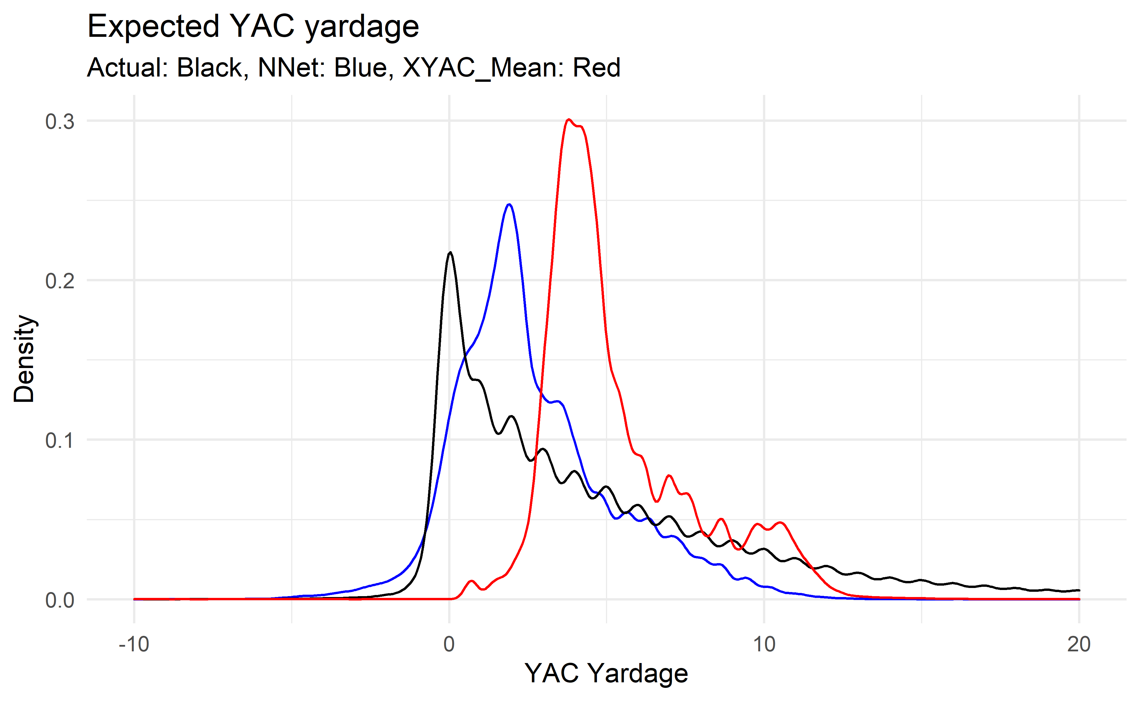 Lastly, let’s visualize our trained model versus both actual YAC yardage and nflfastR’s XYAC mean yards model.