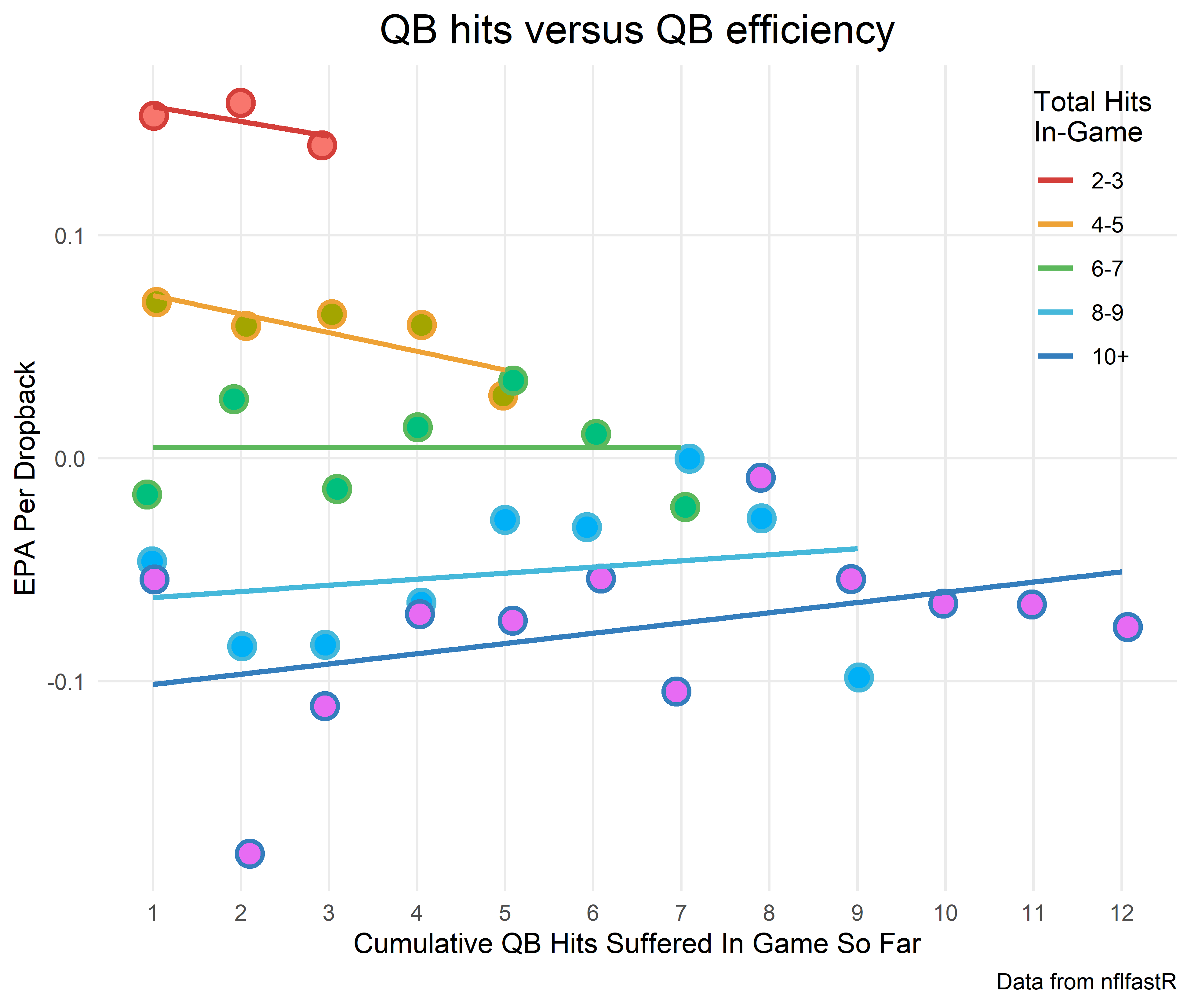 Side note: I’m not showing 0 hits because there’s a mechanical relationship between QB hits and efficiency. It is the one x-axis point that contains 0 hits, by definition, so of course EPA per play is higher: it’s a comparison of a set of plays with no QB hits to other sets of plays with QB hits. I also truncated the x-axis at 12 hits because anything higher is extremely rare.