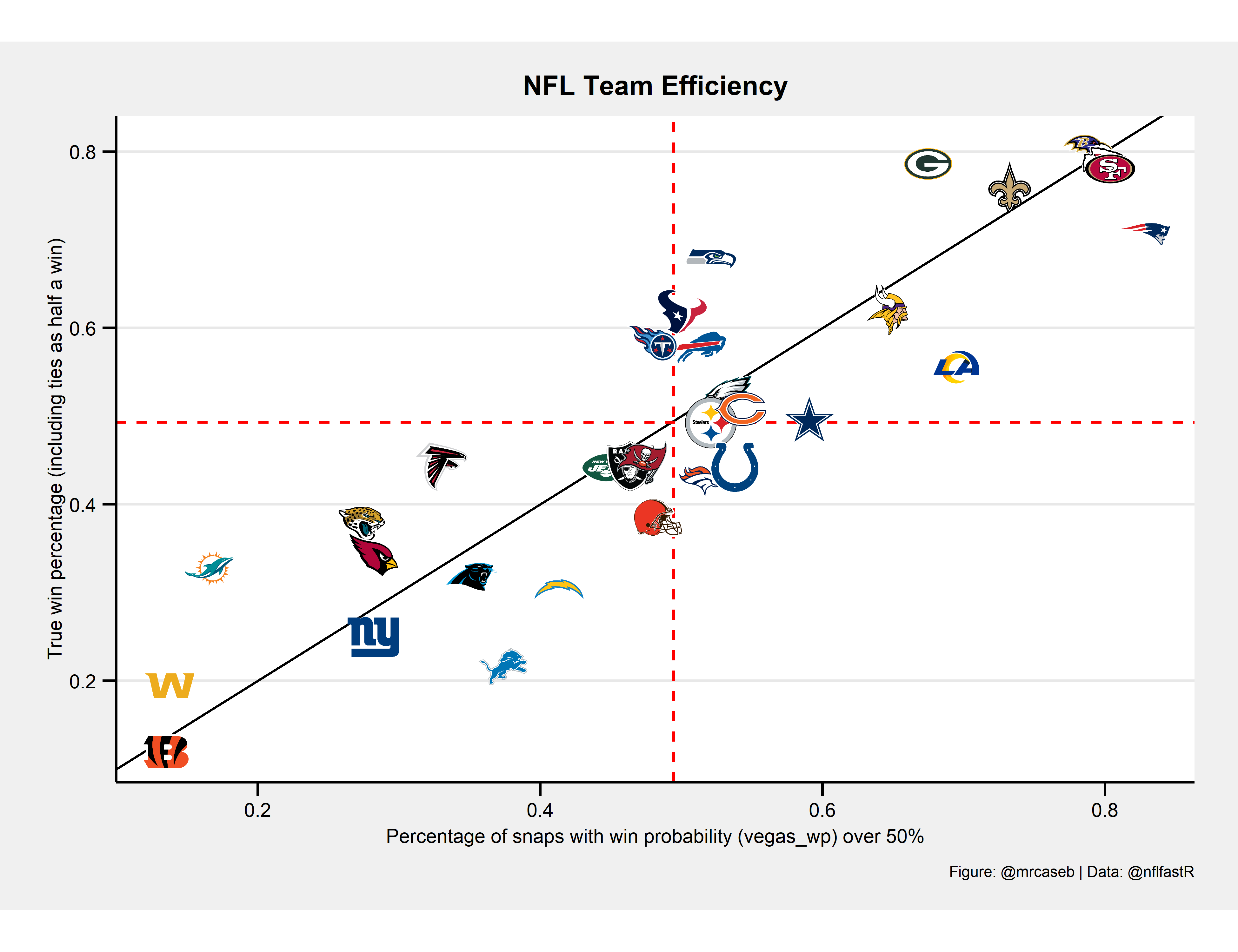 In this post I will show off a very simple way to illustrate that by looking at how many snaps a team played with the nflfastR win probability (model with Vegas line) above a critical value (50%) more or less arbitrarily chosen by me and compare this value with the true win percentage.