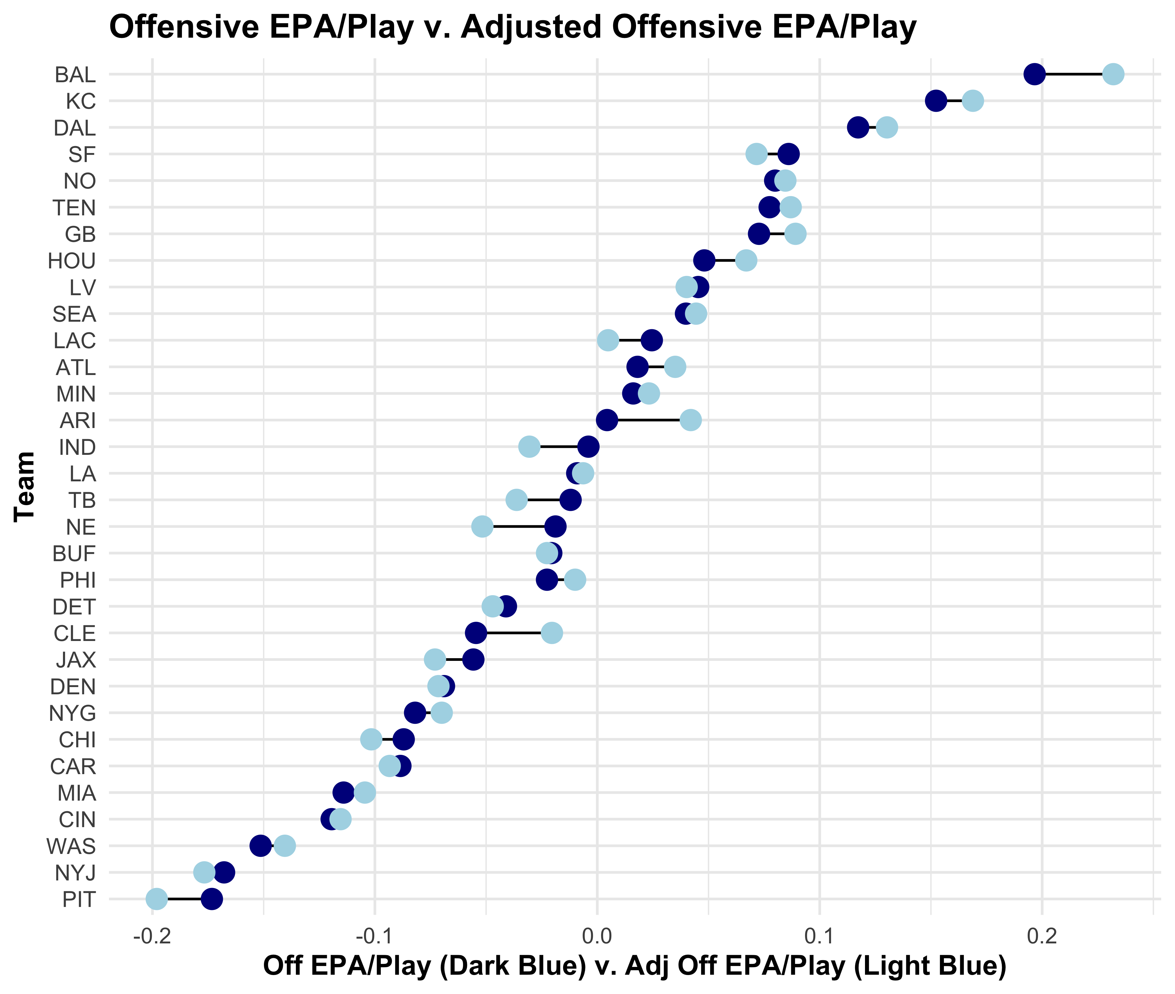 We’re done! You can now view each team’s epa/play adjusted for their strength of schedule. Let’s check out how different the league looks by comparing unadjusted epa to adjusted epa stats.