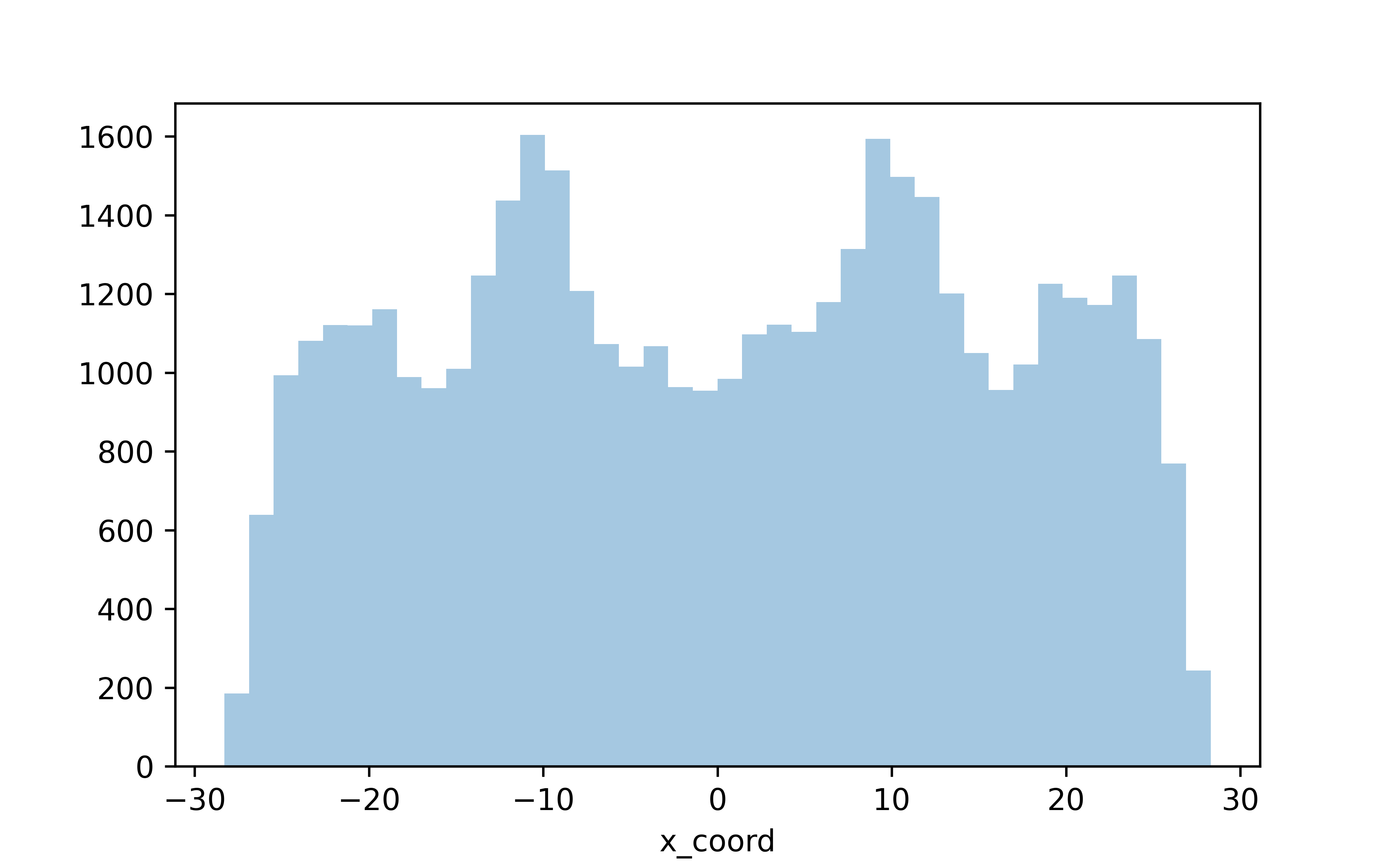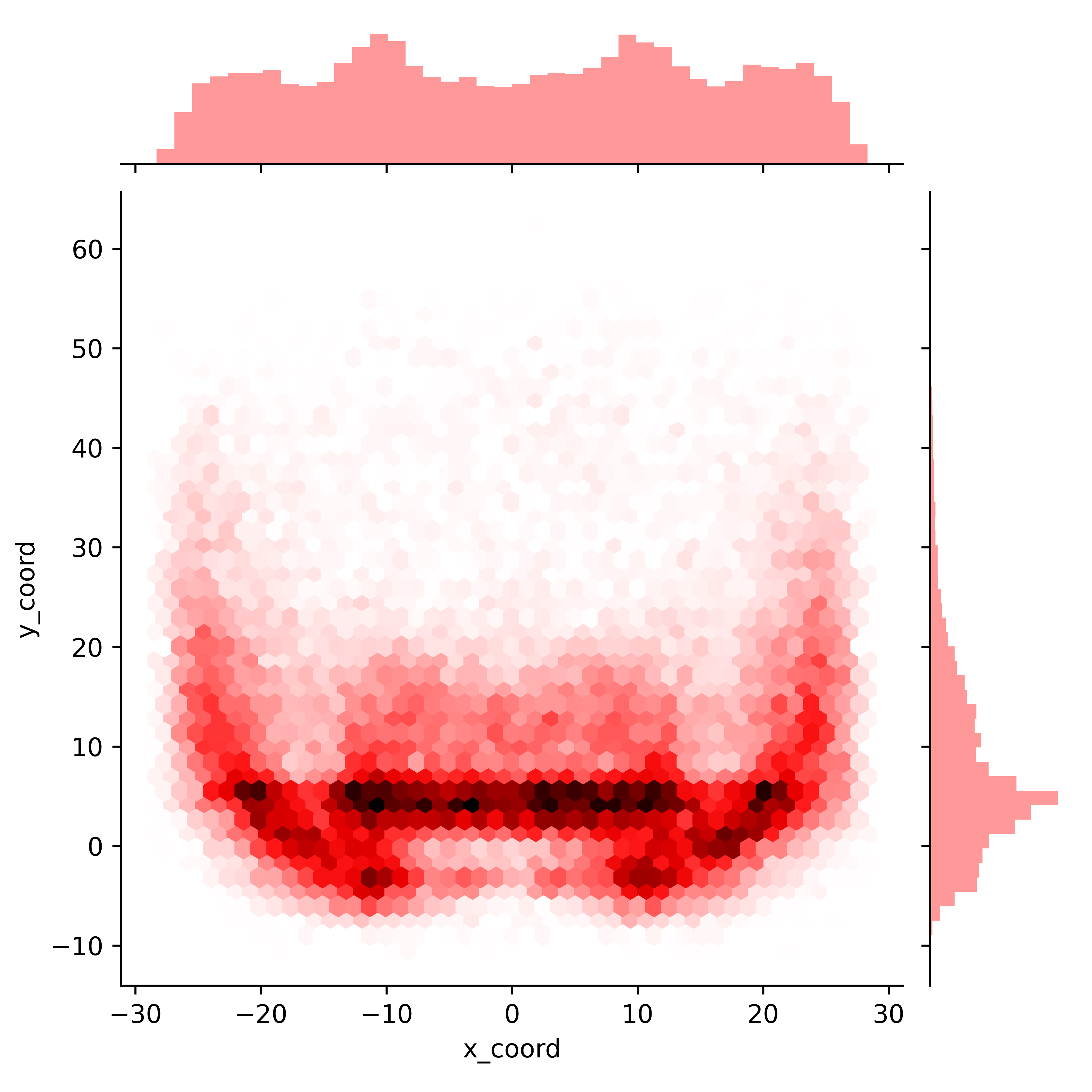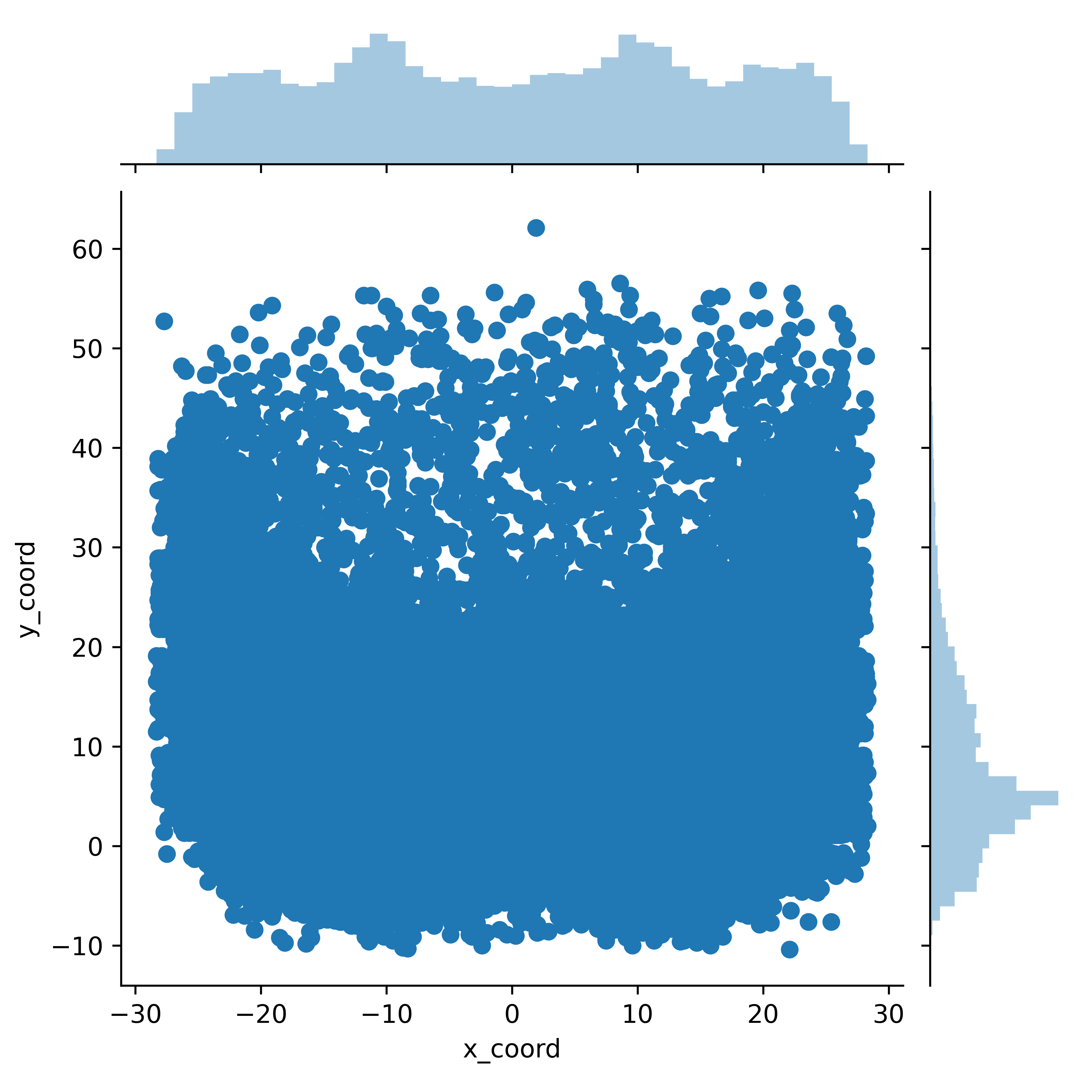 This is neat! We’ve now visualized the data by both the x and y coordinate, and we can see the distributions for both on the side of the graph