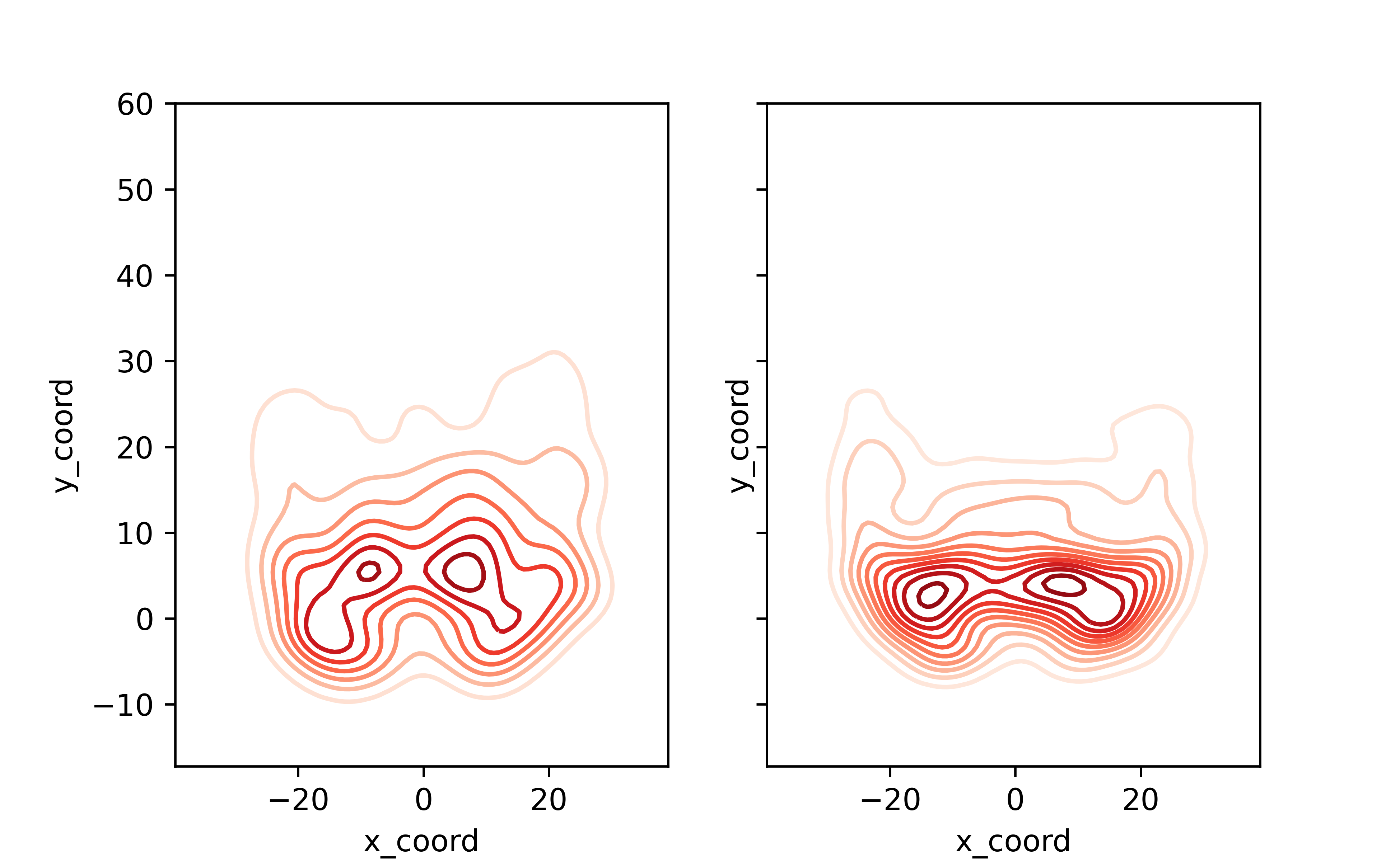 Now the nice thing about these seaborn plots is they do all the heavy lifting for us - but, they don’t let us see the underlying numbers. We can’t see at the coordinate (-20, 10) exactly what density of passes each player has.