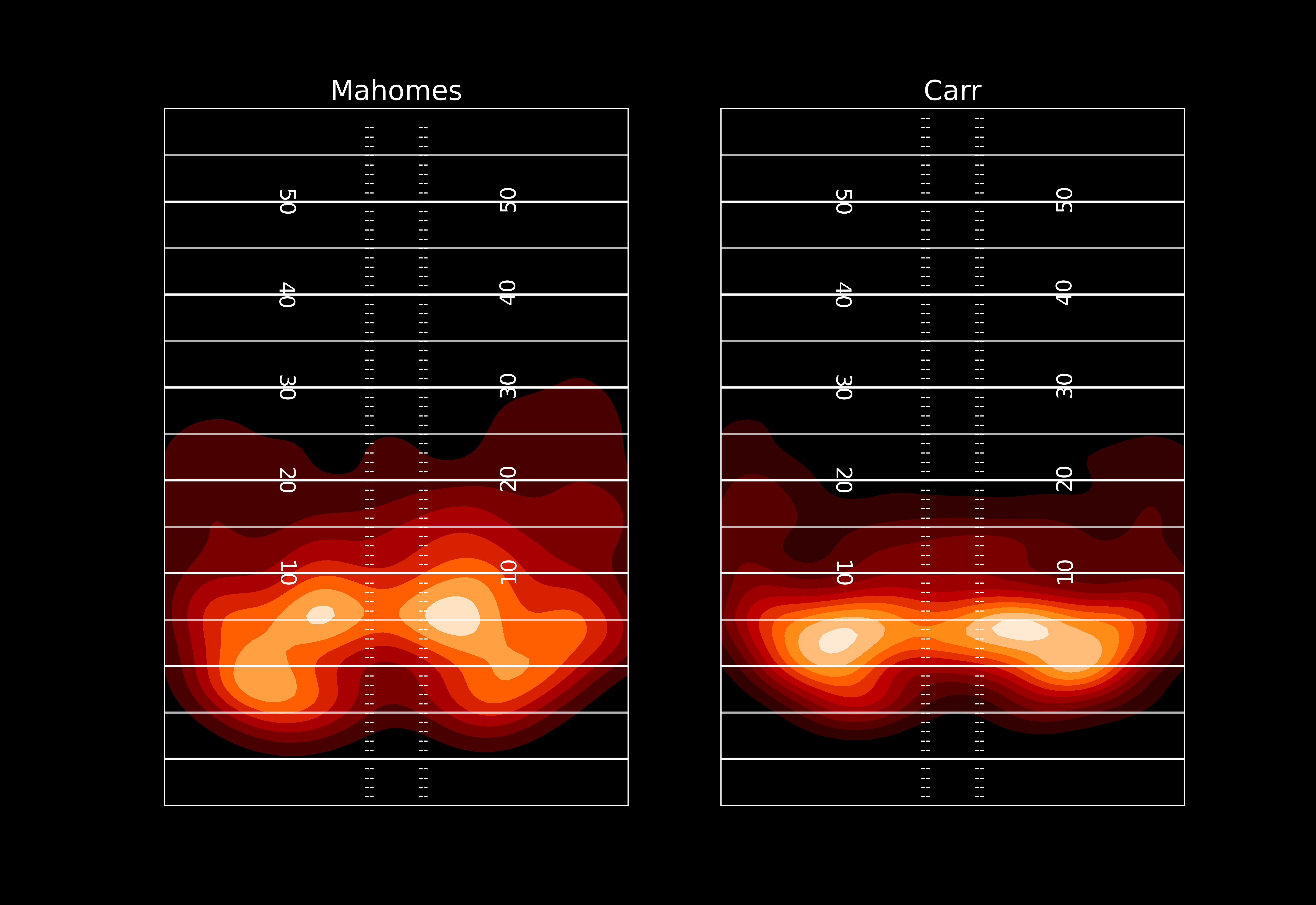 This isn’ too bad! With just a few lines of code we can see that Carr’s passes are more dense around the line of scrimmage, while Mahomes spreads the ball around more.