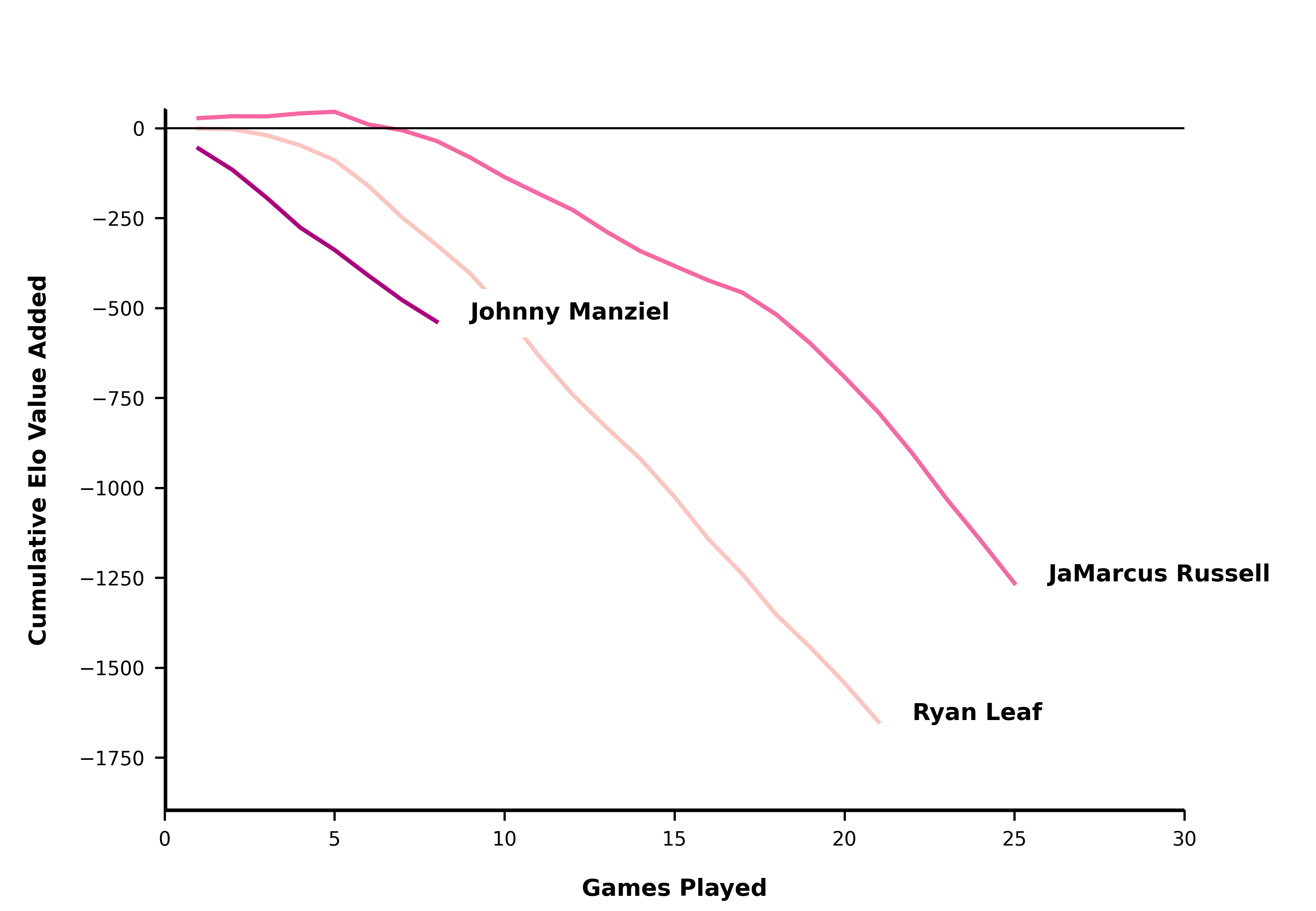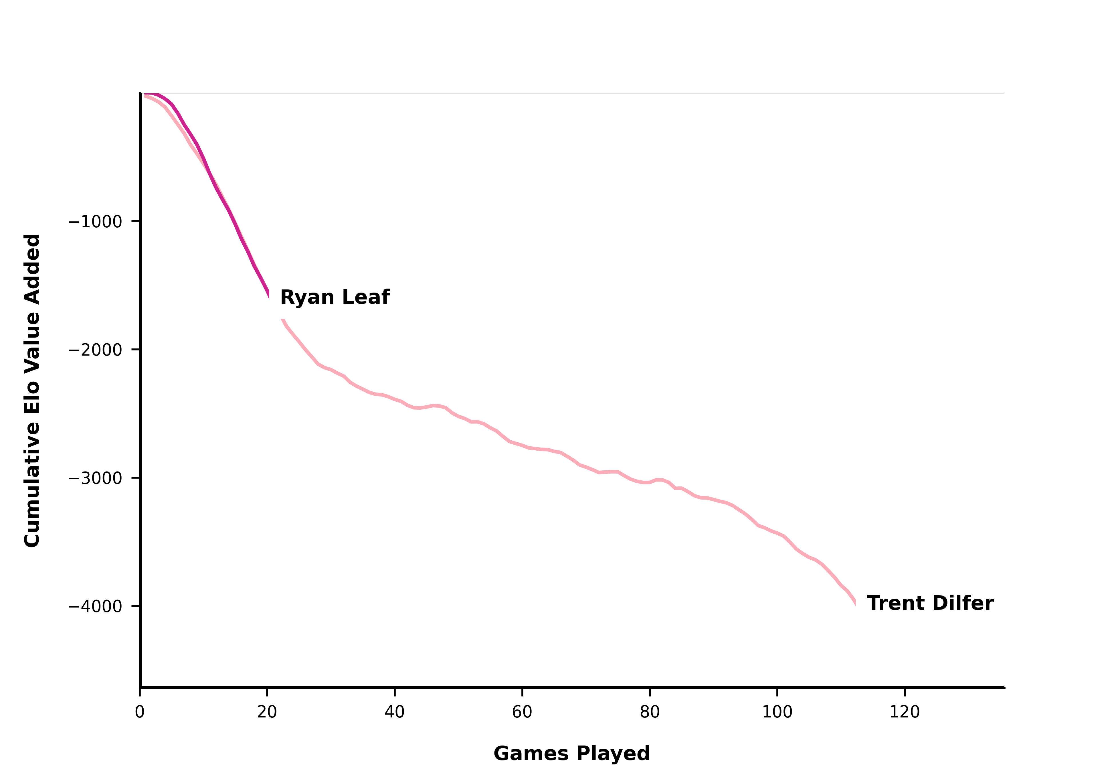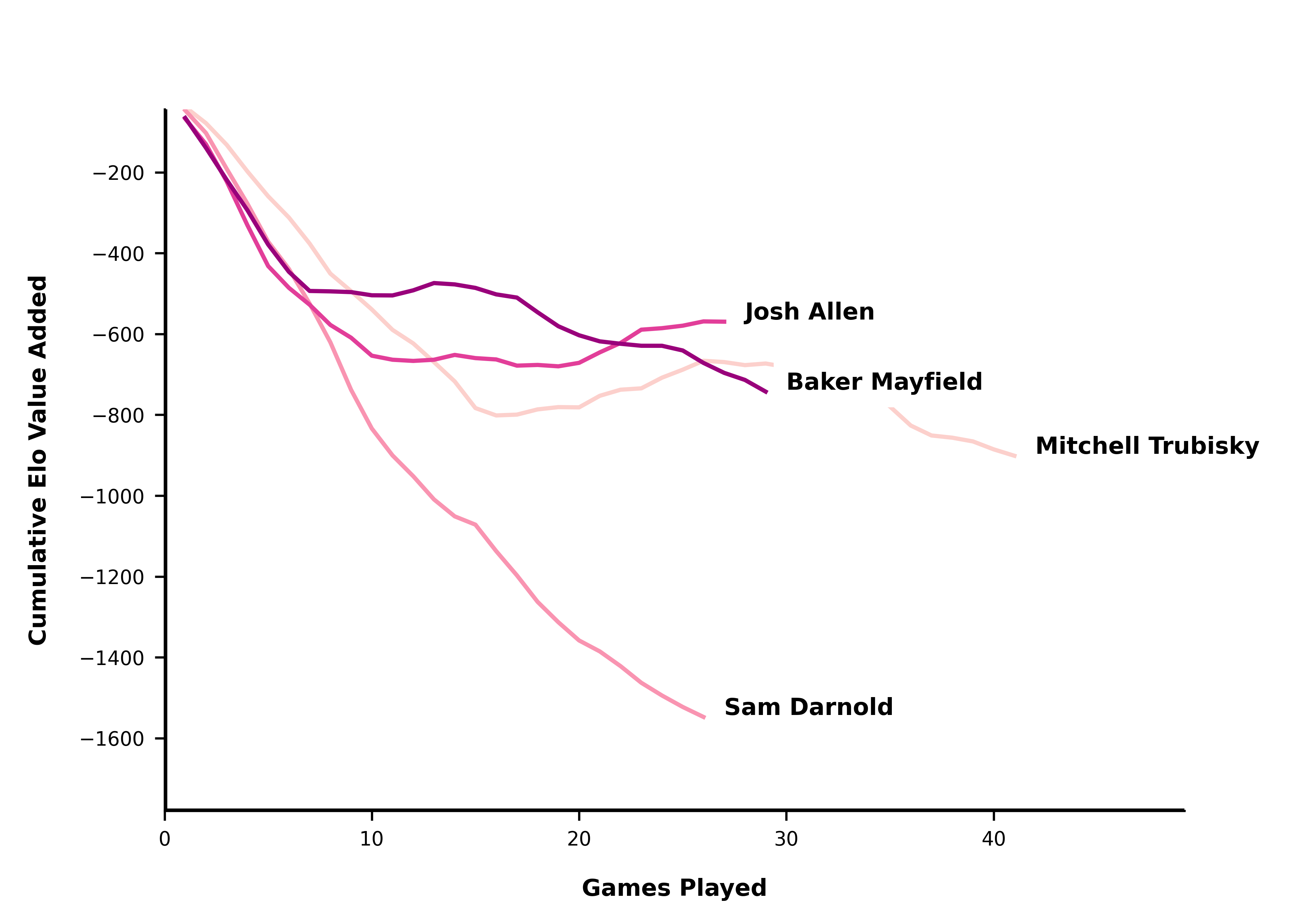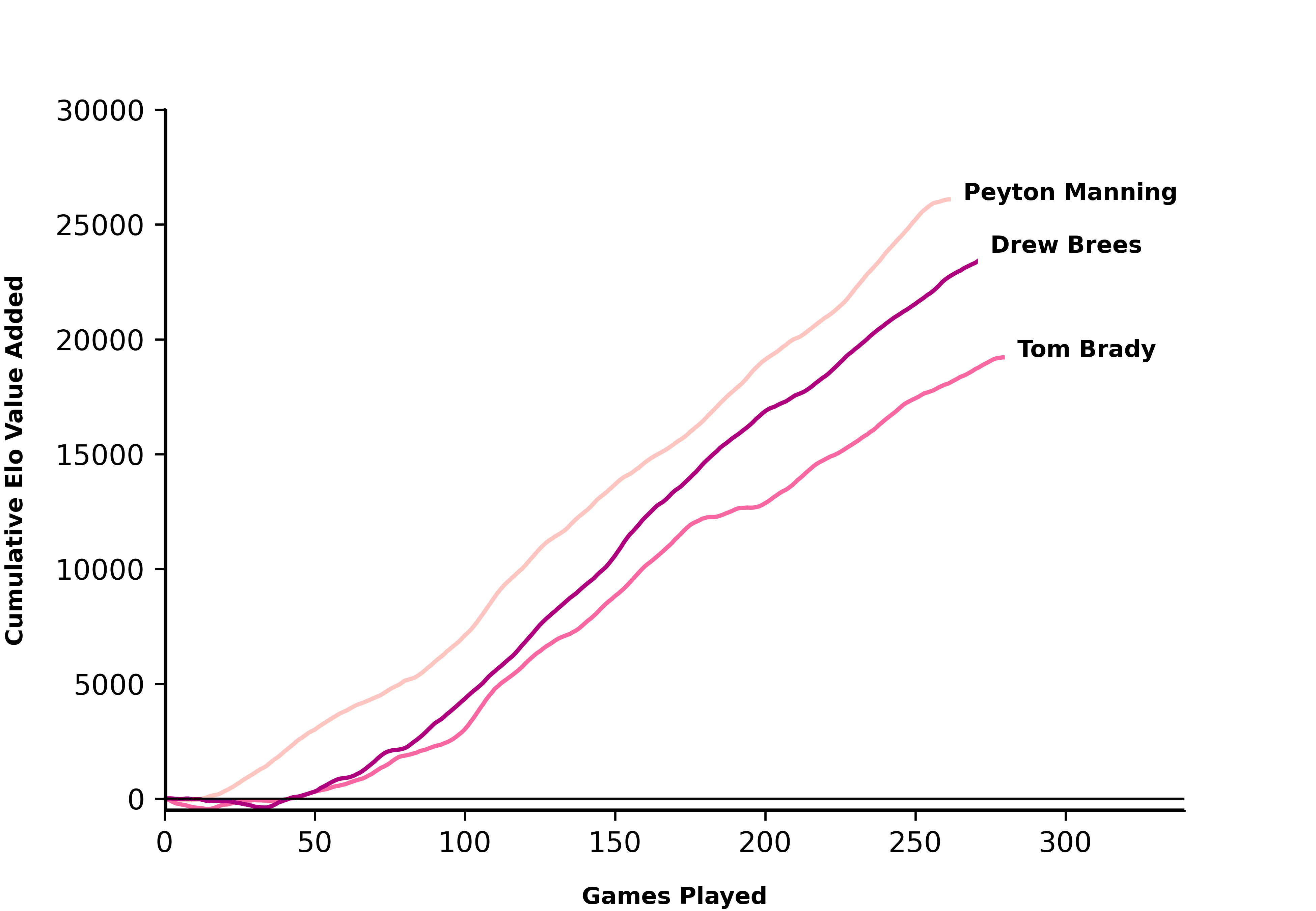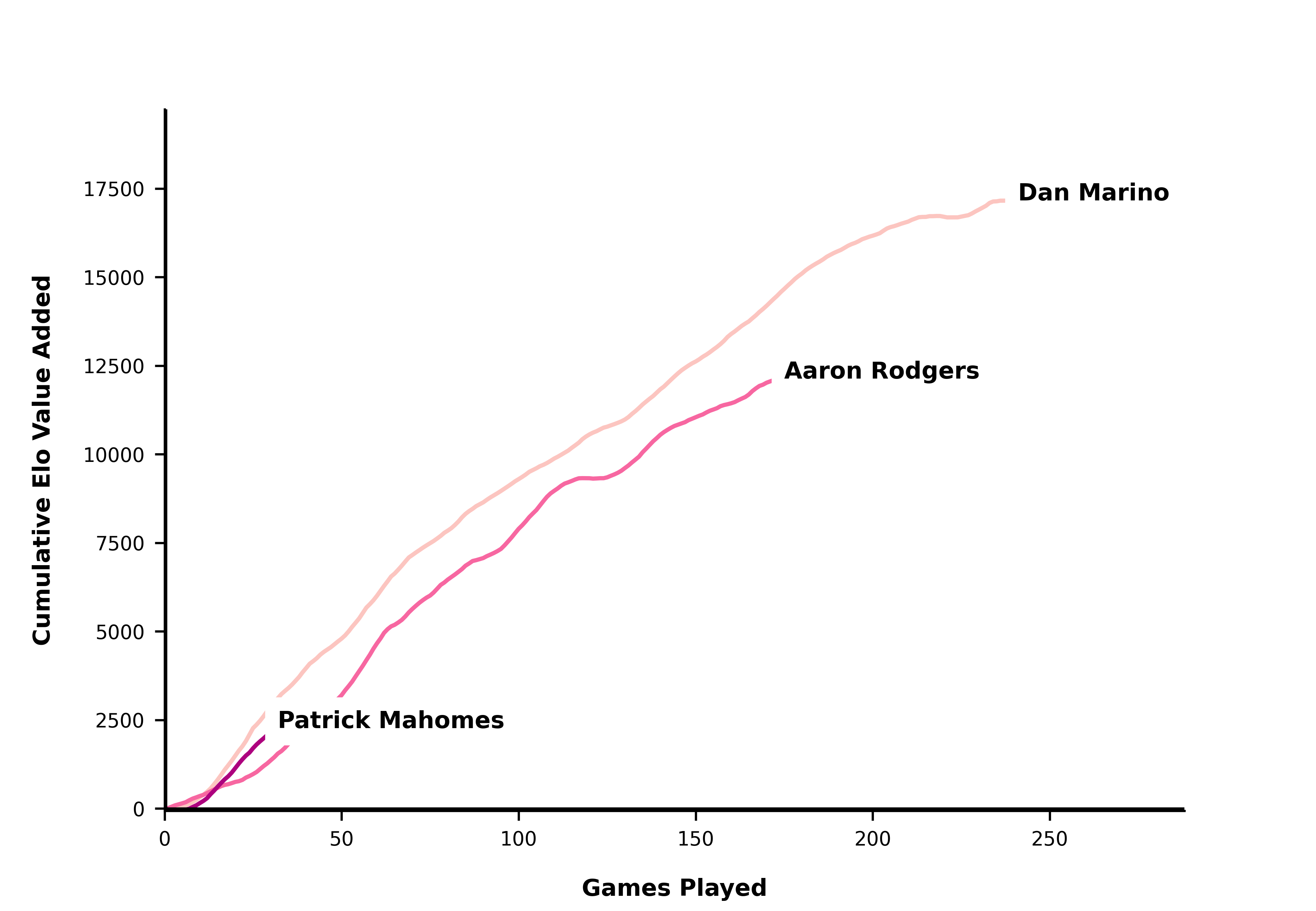 Though simple, era adjusted QB Elo appears to provide a fairly good ranking of QBs across era. One interesting way to leverage this measure further is by comparing cumulative QB Elo gained over the course of a QB’s career.