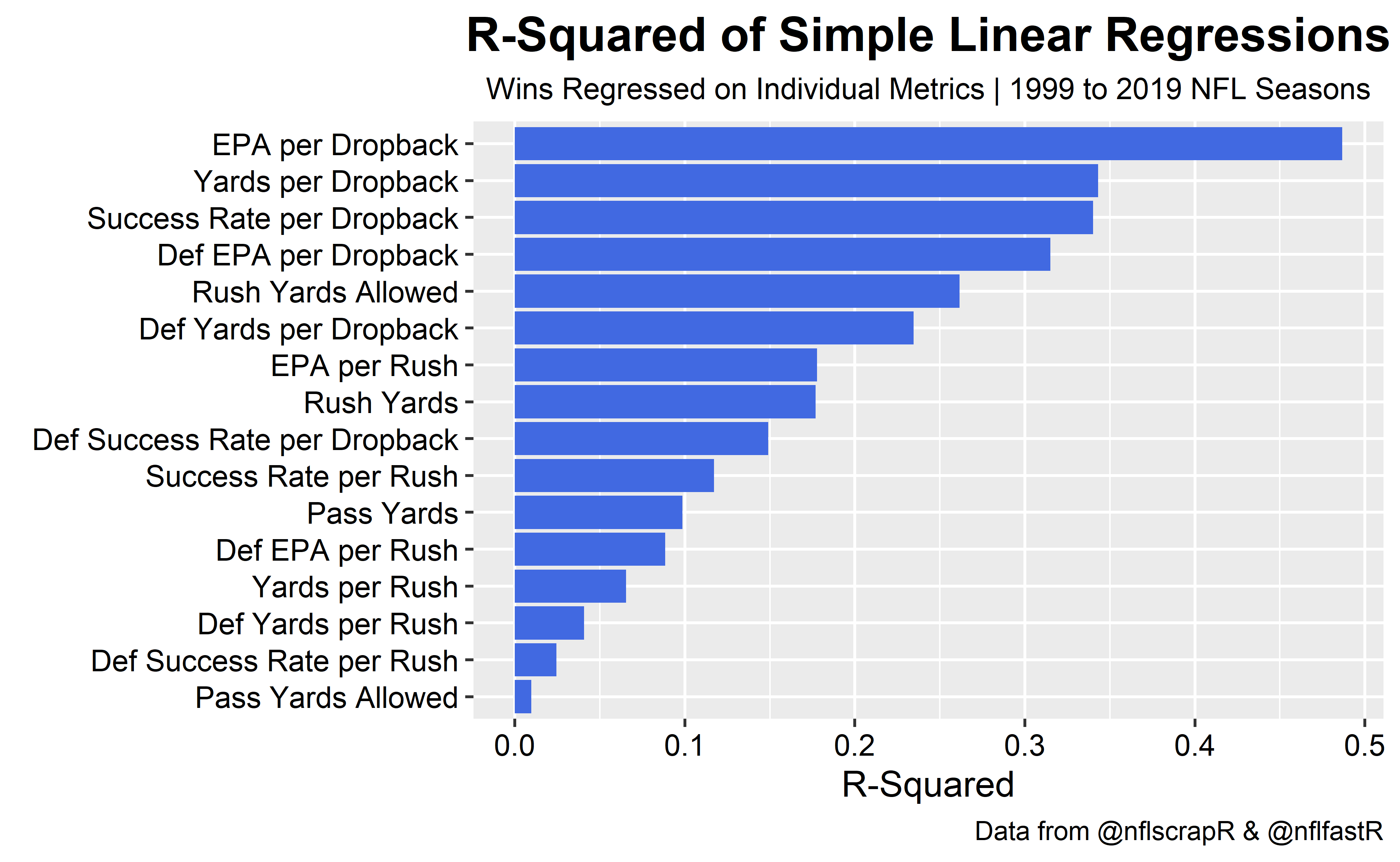 What can two decades worth of play-by-play data and some math tell us about what wins games in the NFL? Let’s look at some simple linear regressions using metrics we can easily compute with nflfastR data.