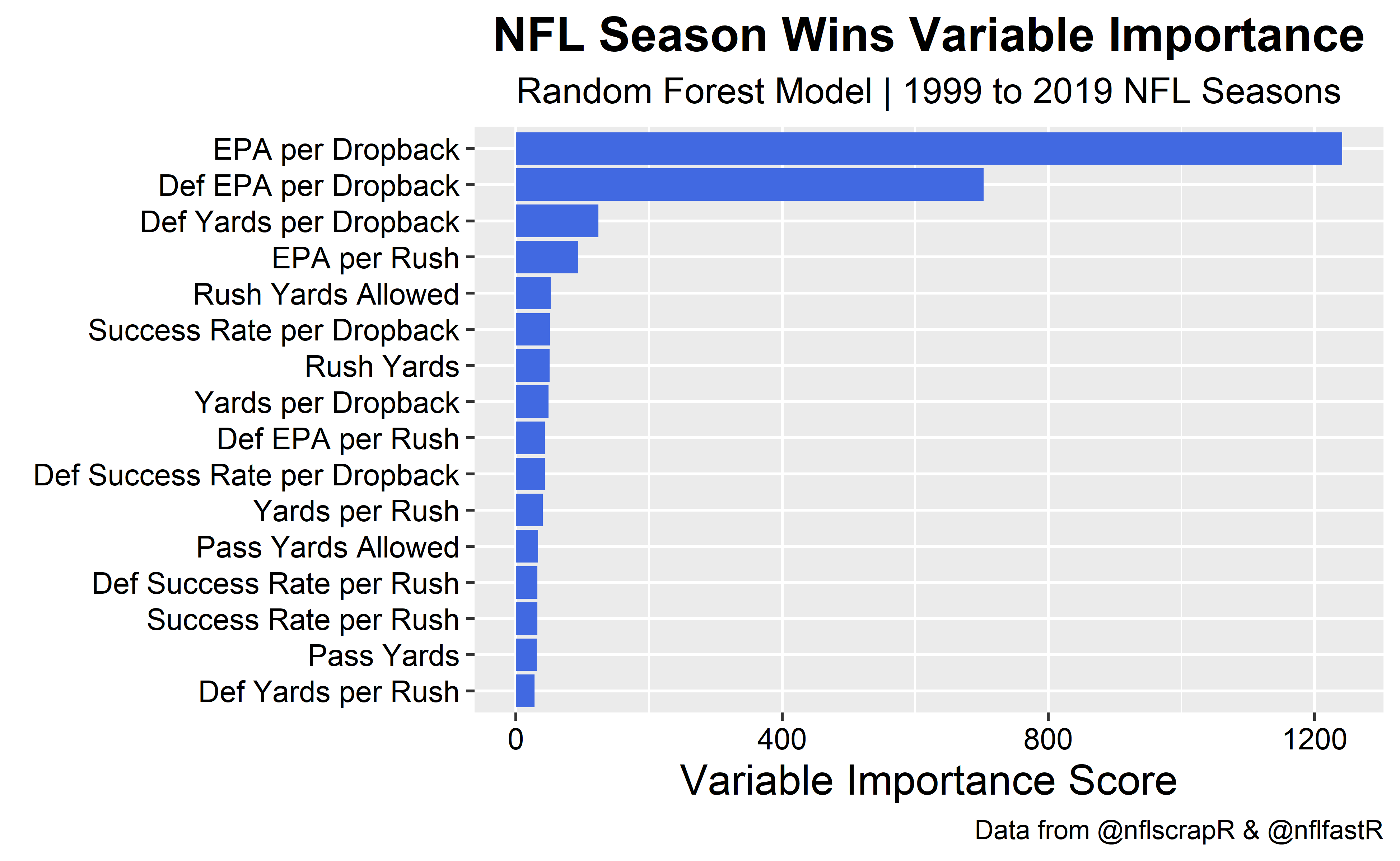 We can also build a random forest model and let the model tell us what features yield the most information gain. Again, passing efficiency is the largest driver of wins and it is not particularly close.