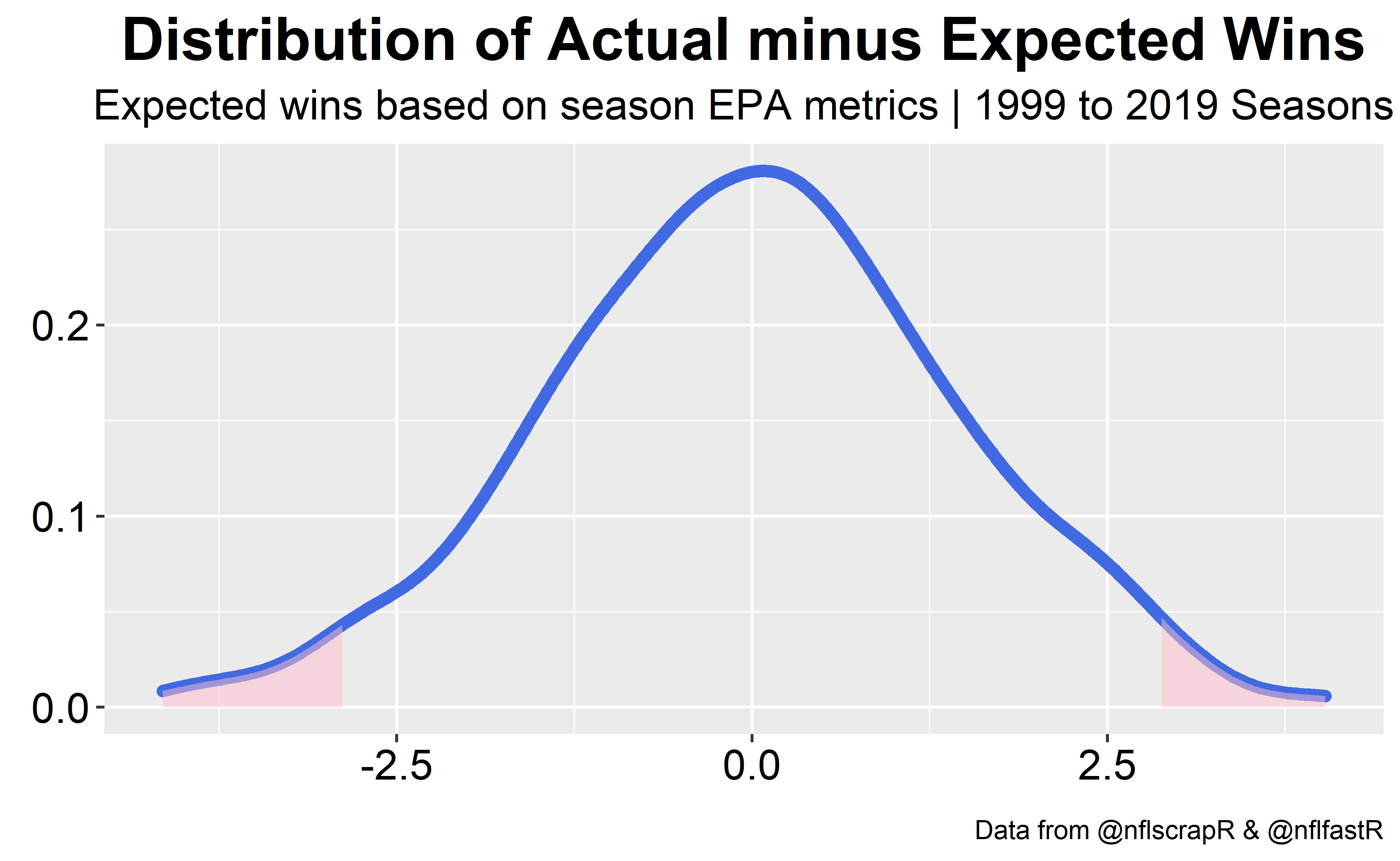 We can use the regression formula to develop expected wins based on EPA per play metrics. The distribution of actual wins minus expected wins is normally distributed with a mean of 0 and a standard deviation of 1.4 wins.