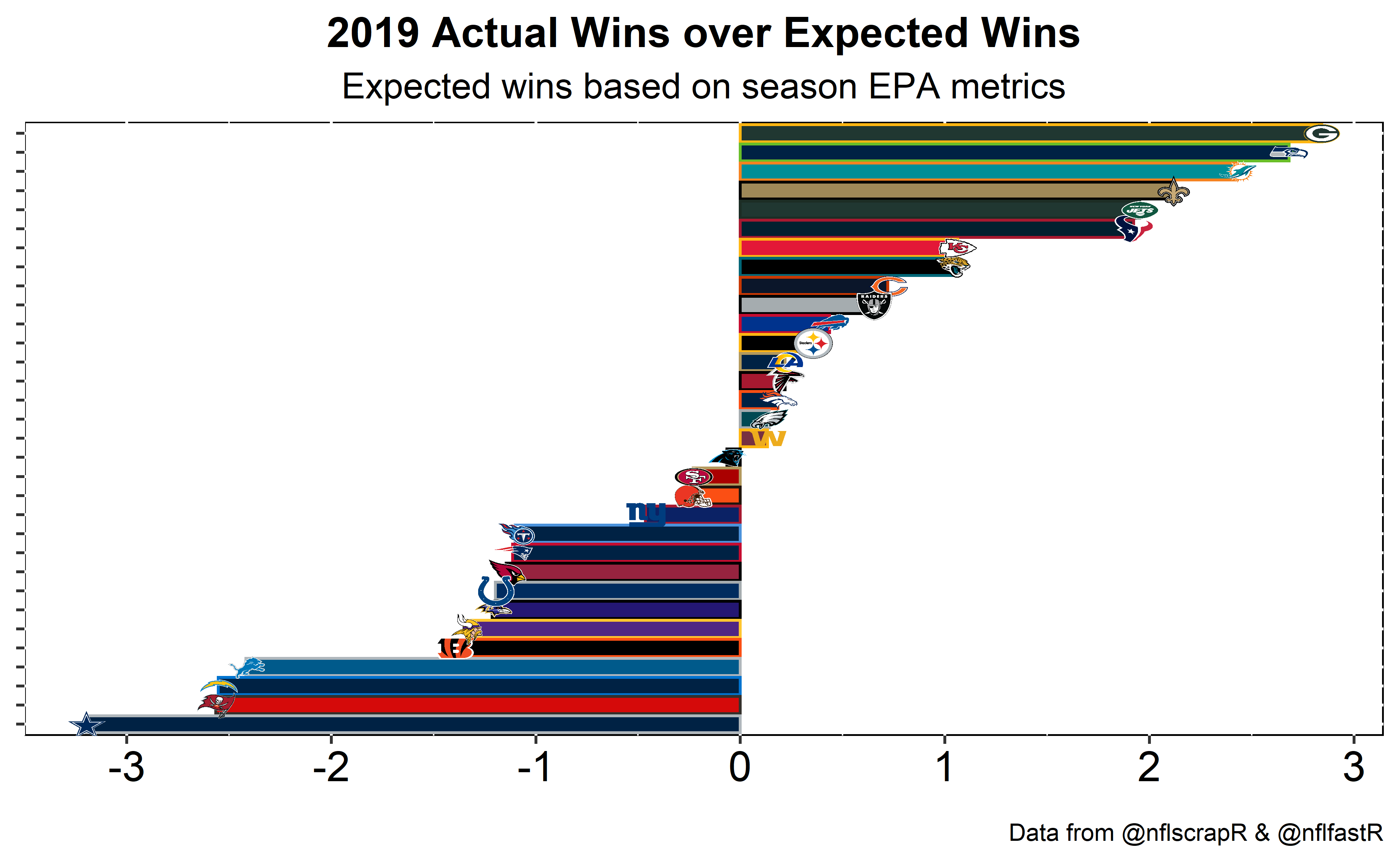 Based on our expected wins formula the NFC North champs were predicted to have 10 wins while they actual won 13. Additionally, the team they beat to get to the NFC Championship looked more like an 8 win team rather than an 11 win team. On the other end of the spectrum the Cowboys produced EPA per play metrics that predicted an 11 win team, however, they ended up 3 wins short.