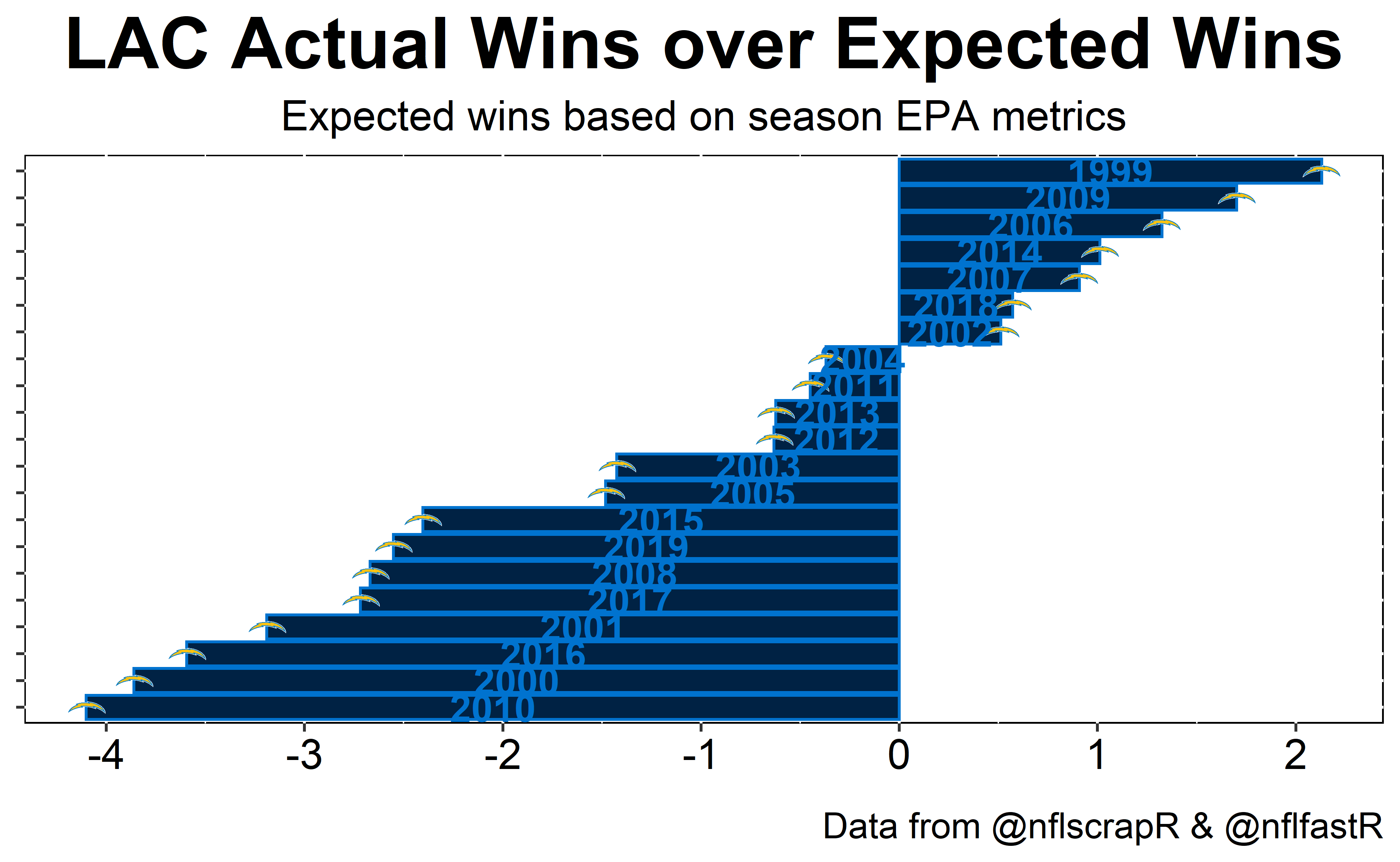 Of the 669 season long performances in the data only 38 teams under performed by more than 2.35 wins. The Chargers account for over a fifth of those seasons.