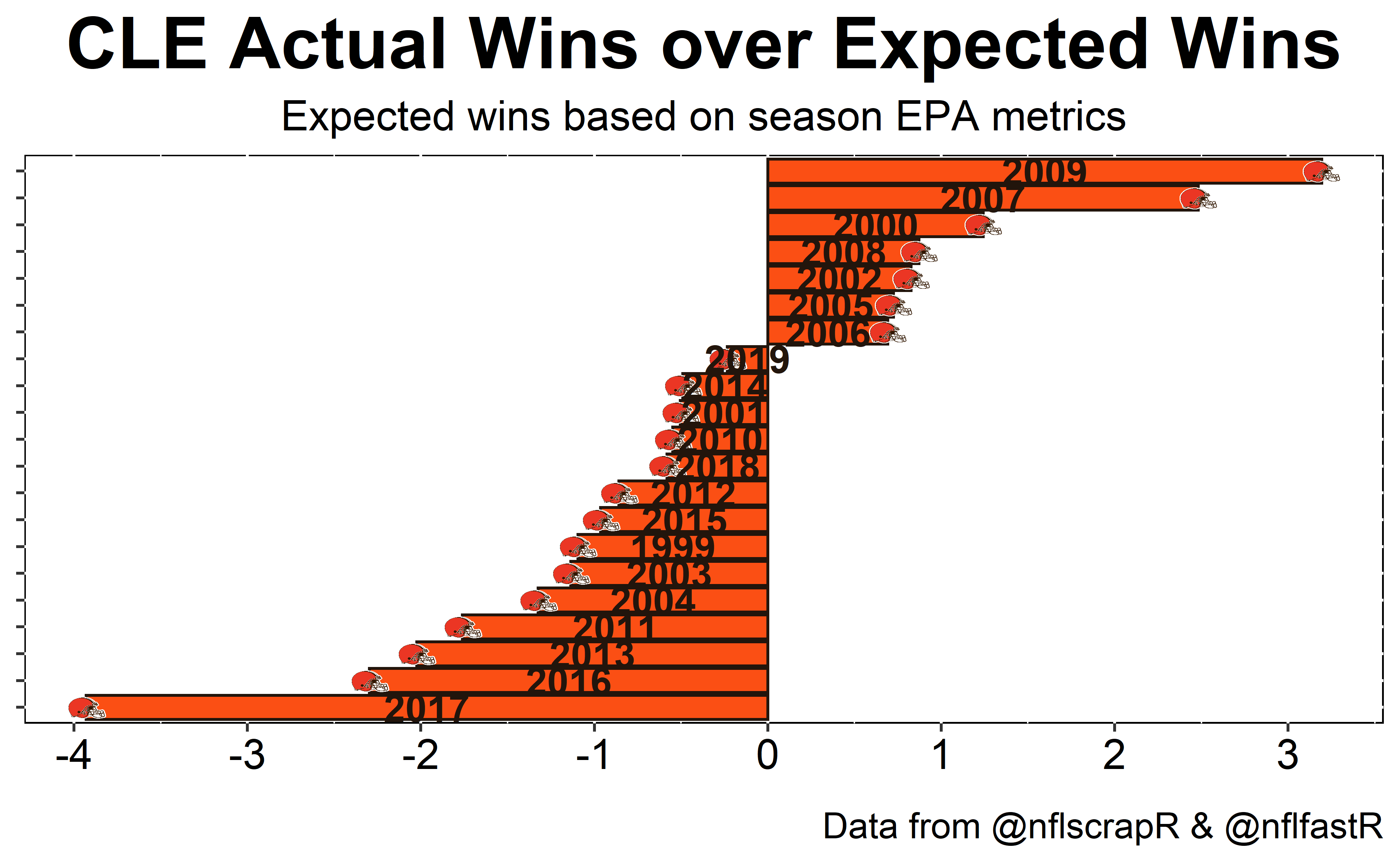 The Browns have not over performed since 2009 when they won 5 games but this model saw them as more of a 2 win team.