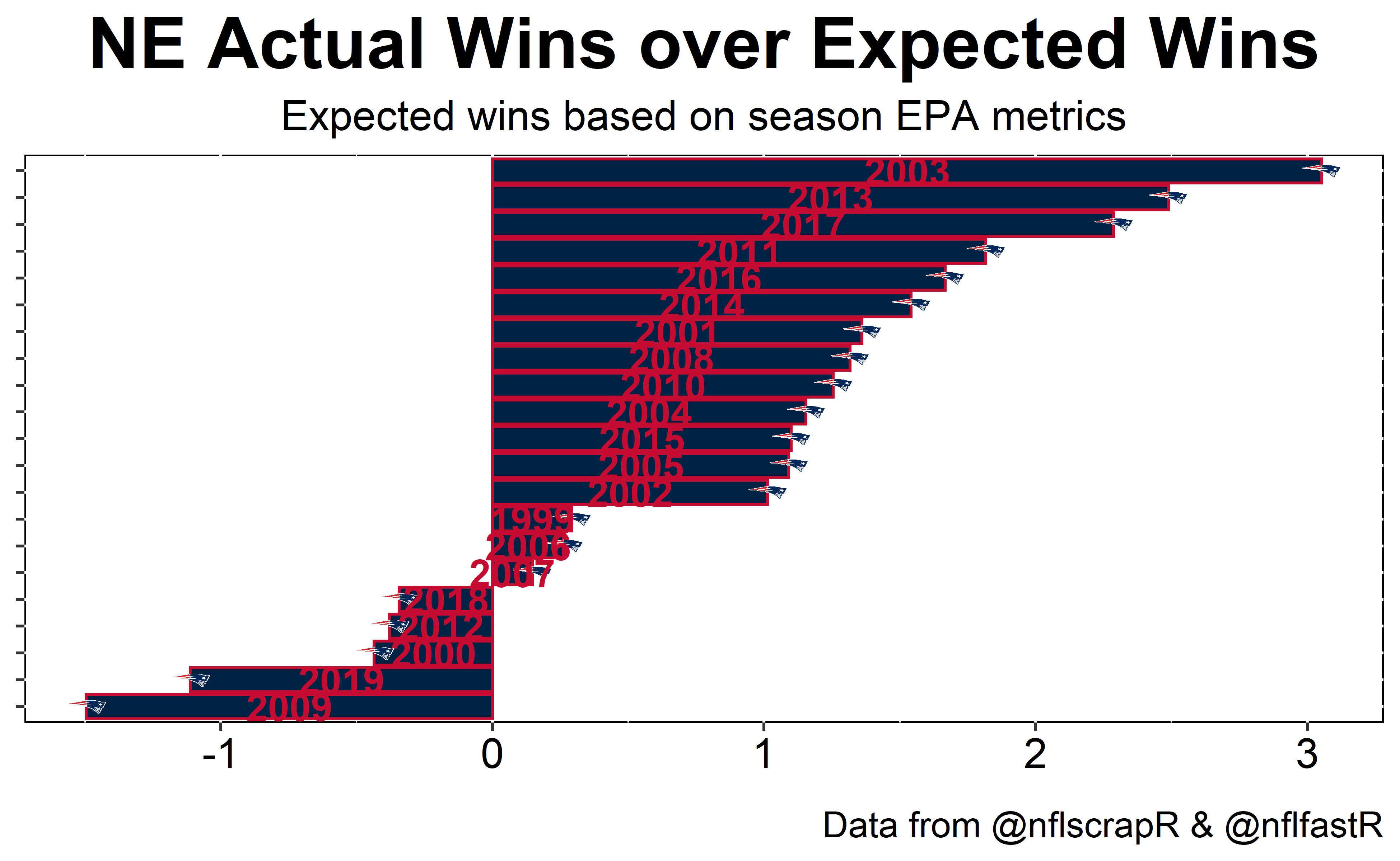 On the other end of the spectrum the Patriots have only under performed by more than half a game two times.