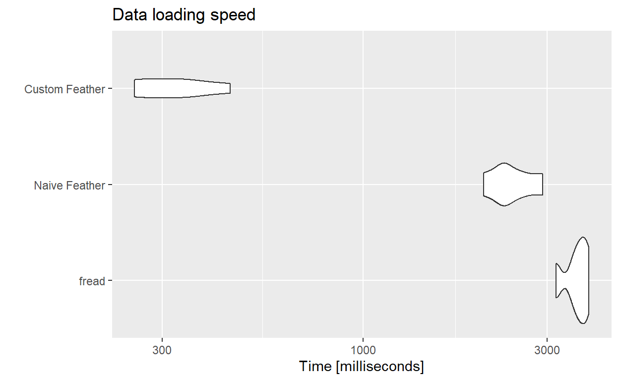 We’ve gone from loading online in about 60 seconds, to fread in 3-5 seconds, to feather around 2 seconds, but by saving our dataset in a novel way we can reduce our look ups to fractions of a second.
