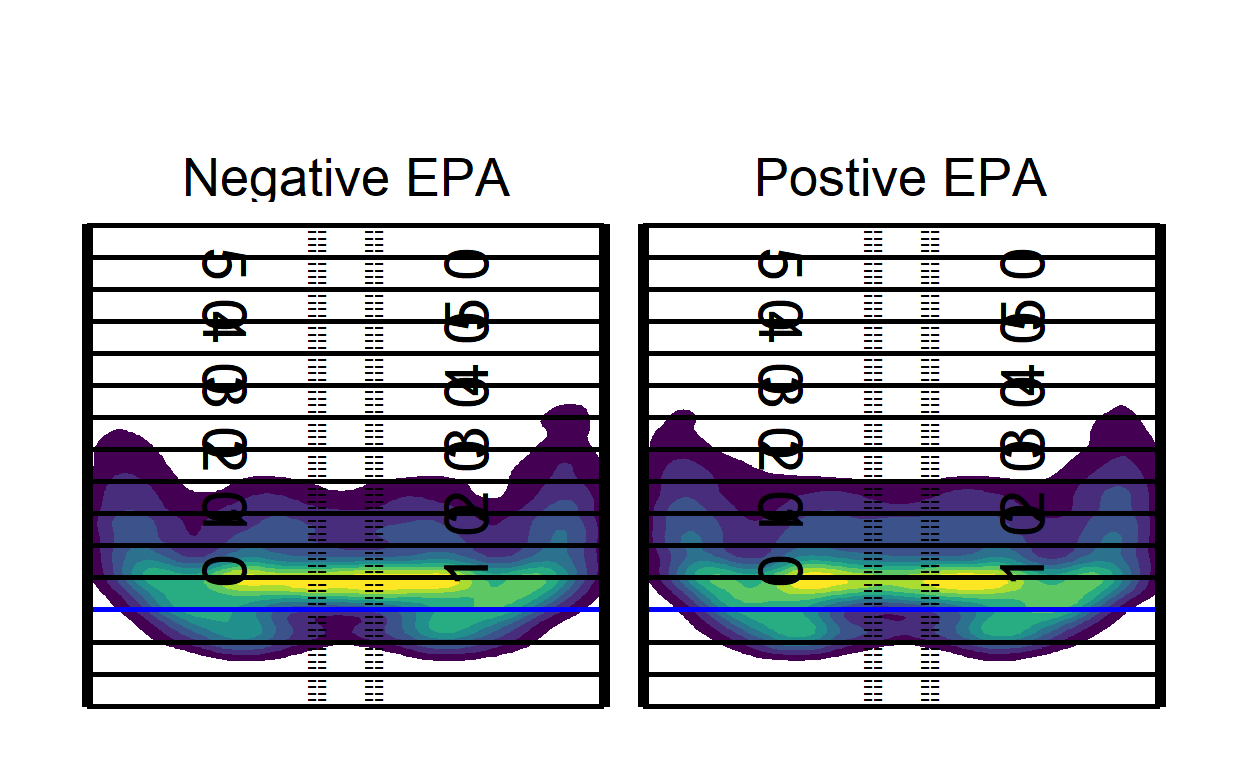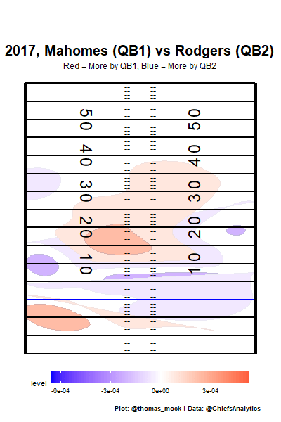 compared_z <- rbind(qb_density_compare(pass_map_df[pass_map_df$season == i], "P.Mahomes", "A.Rodgers", n = 200) %>% mutate(season = i), compared_z)
