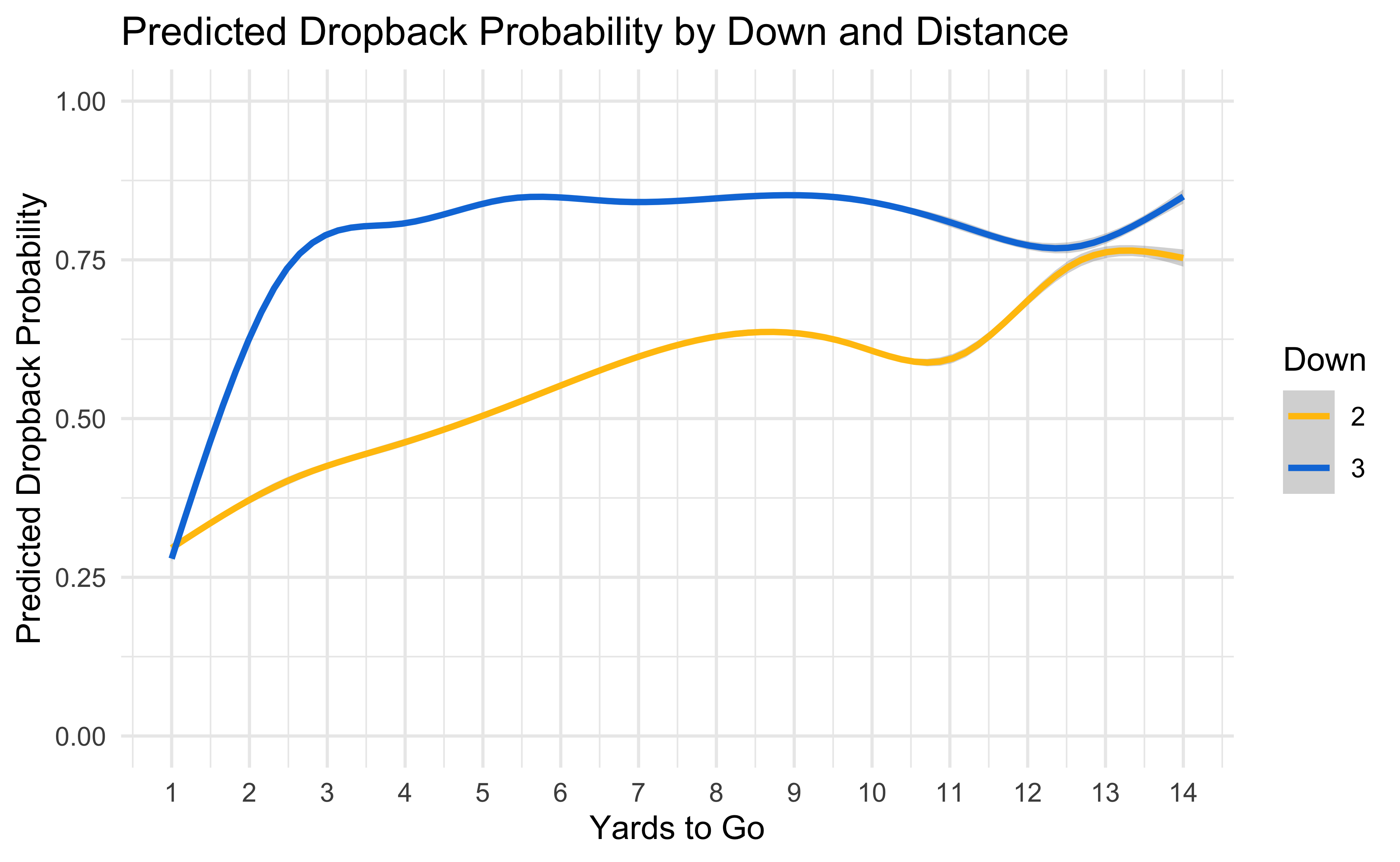 As a basic sanity check let’s make sure the model thinks passing is more likely in situations that we would expect. Generally speaking, throwing is more likely on third down and more likely with more yards to go which is what we’d hope to see.