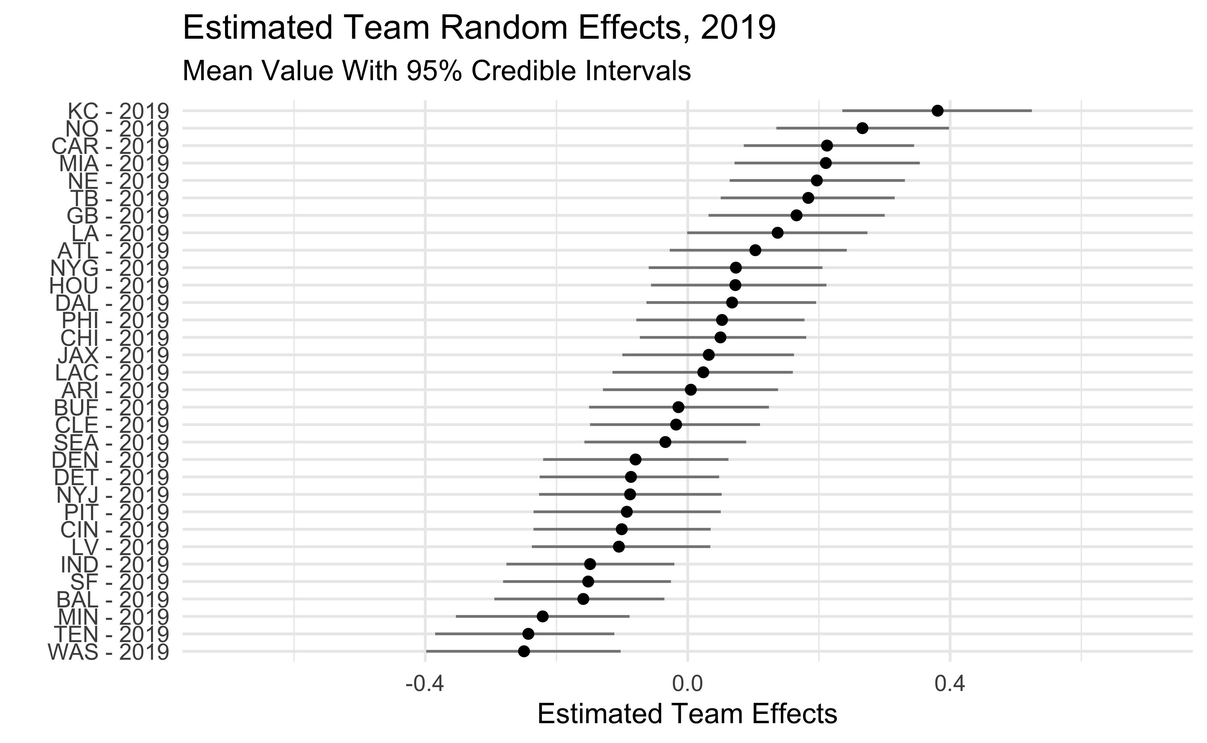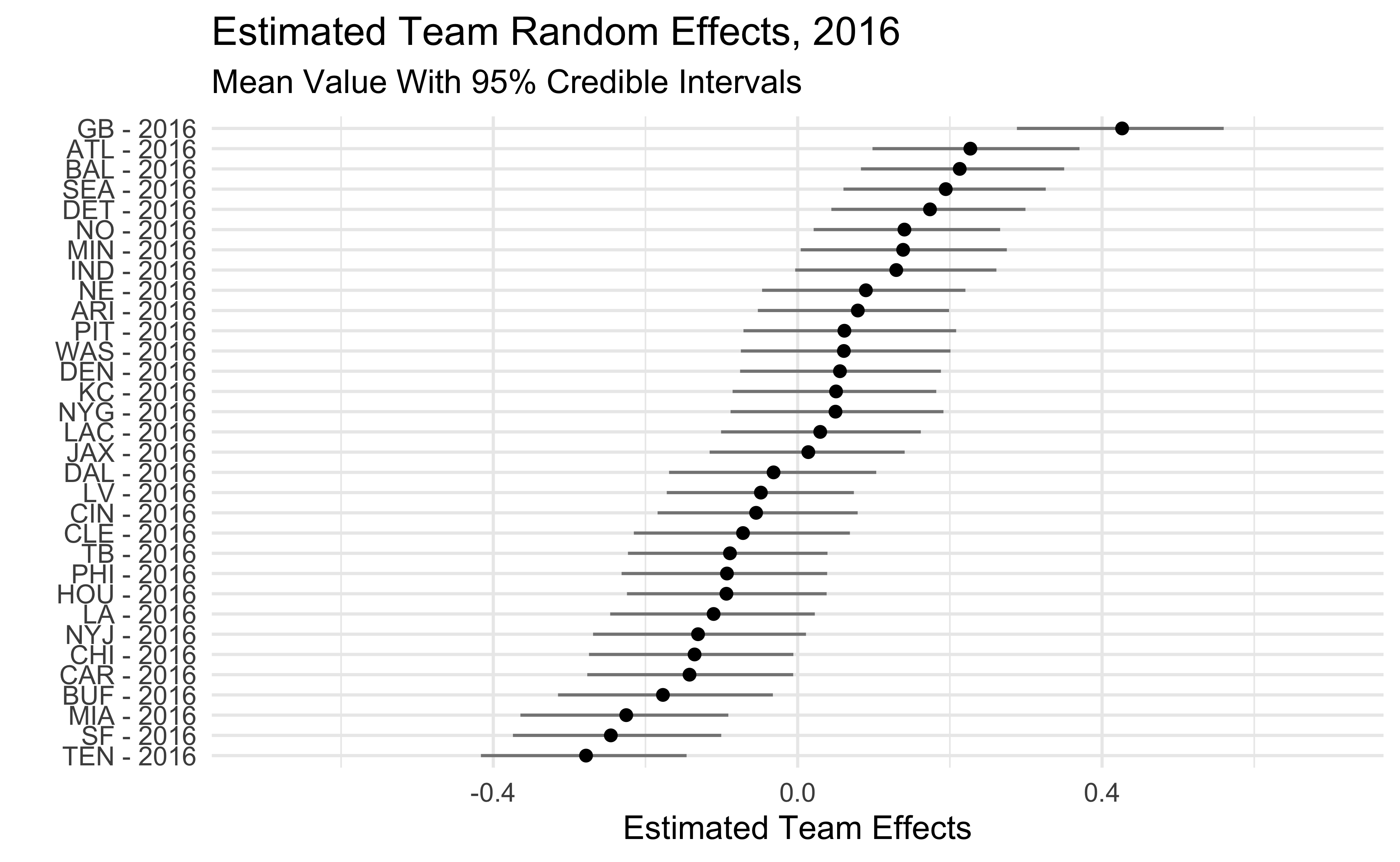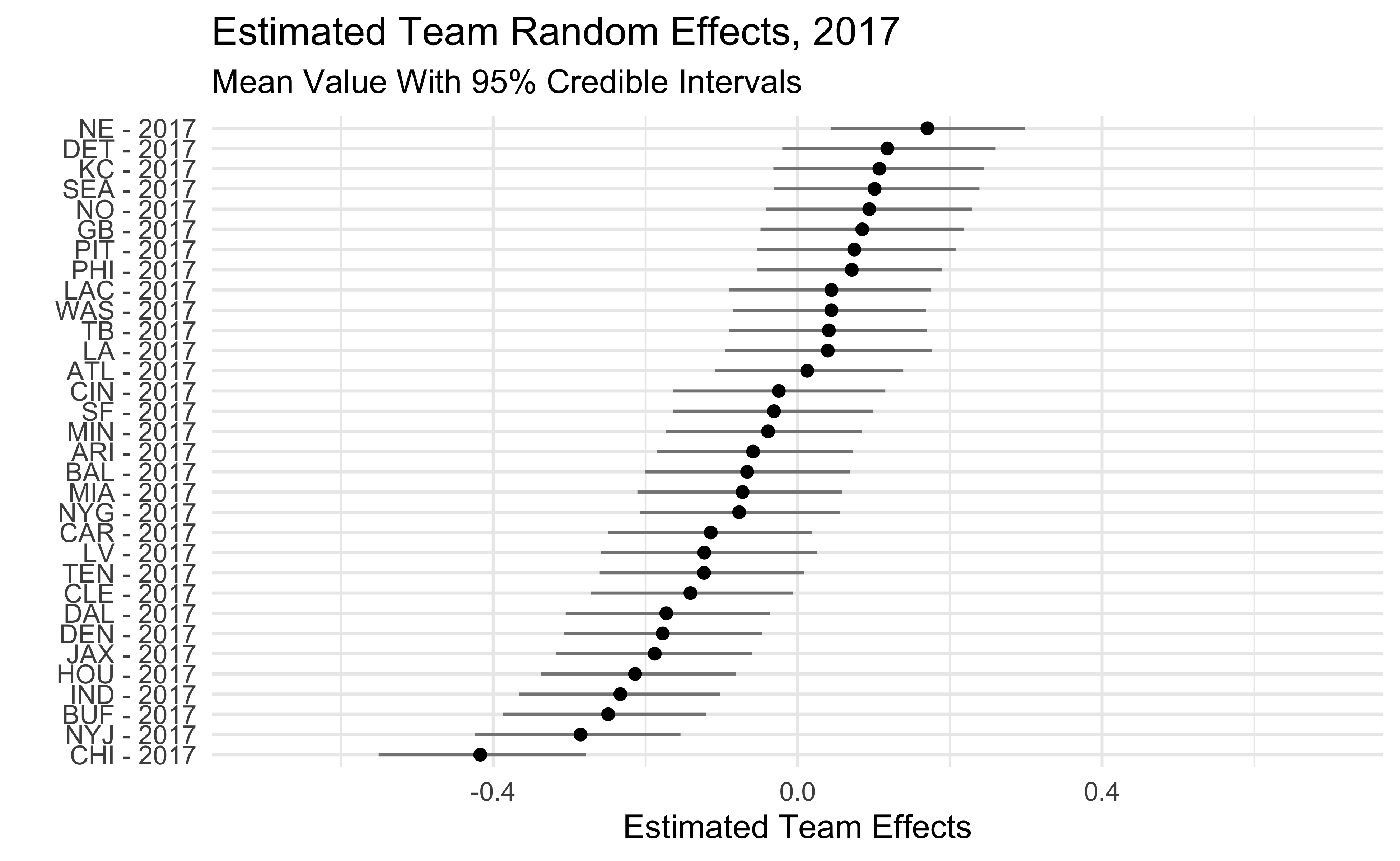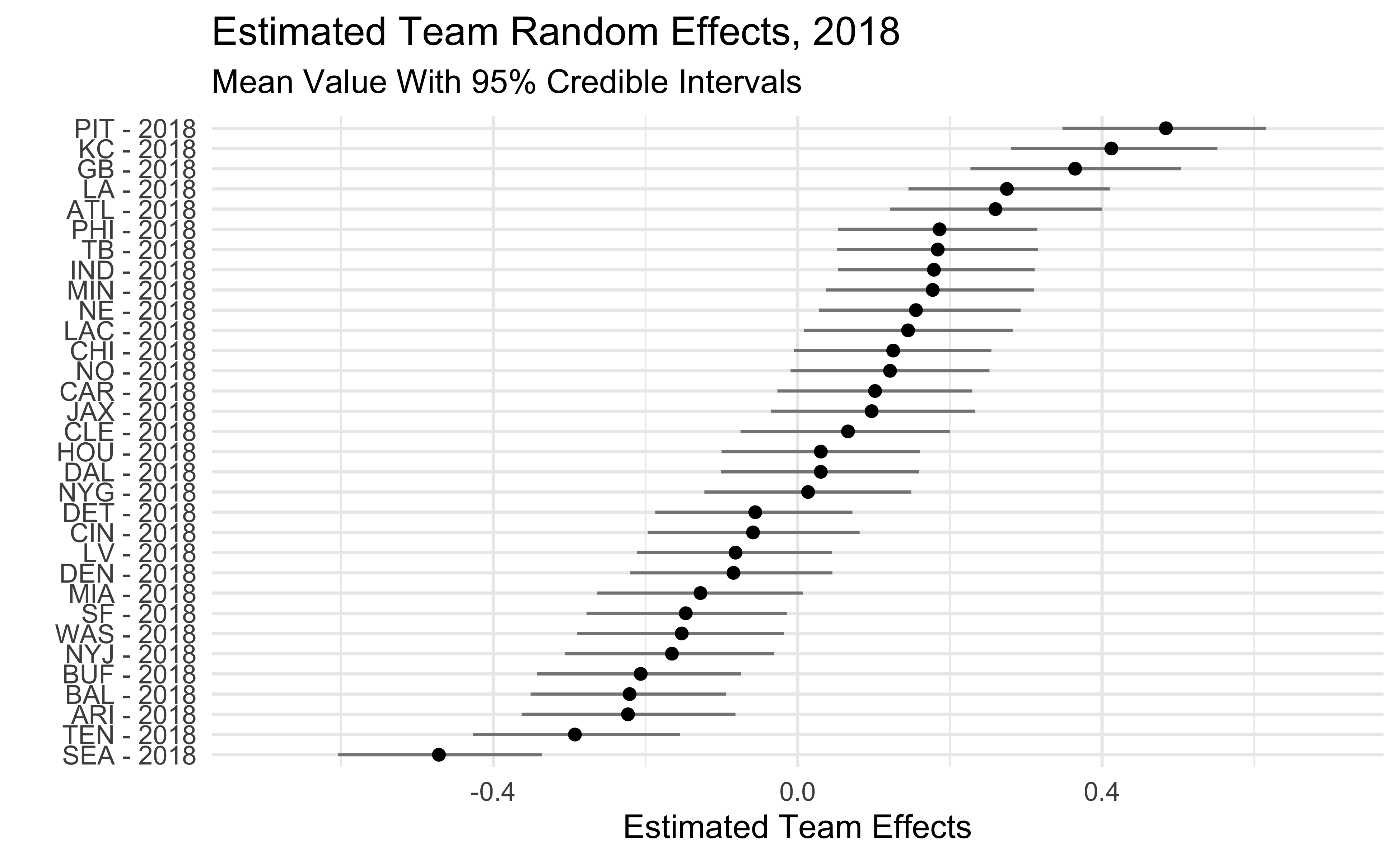 The plots below show the estimated team effects. Note that the effects on the x-axis are on the log-odds scale. The 2018 Seahawks estimate of -.47 means that we would predict a Seahawks pass with probability .38 in a situation where the league-wide probability is .5. We would predict the 2018 Steelers to pass with probability .62 in that same situation.