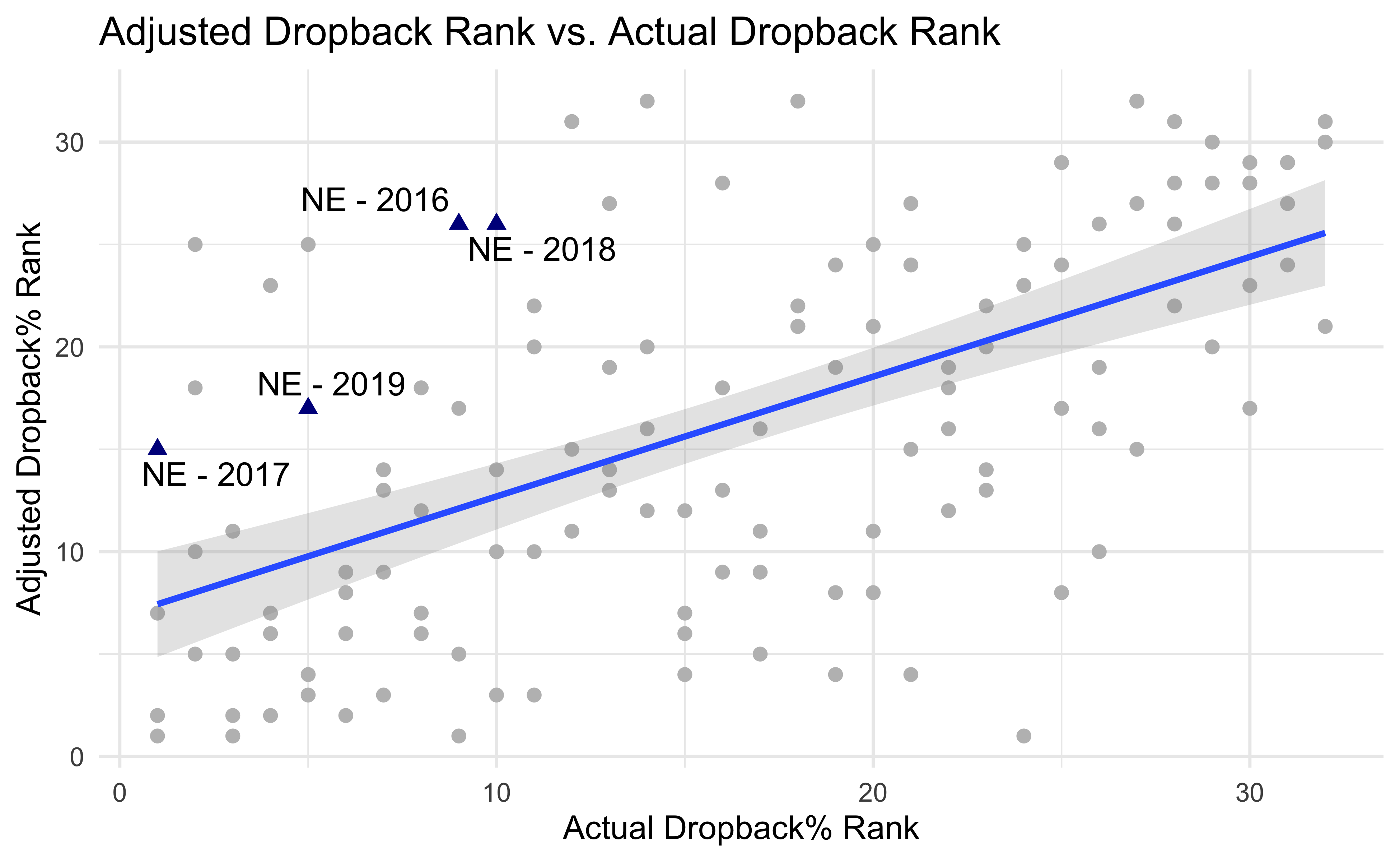 labs(title = "Adjusted Dropback Rank vs. Actual Dropback Rank")