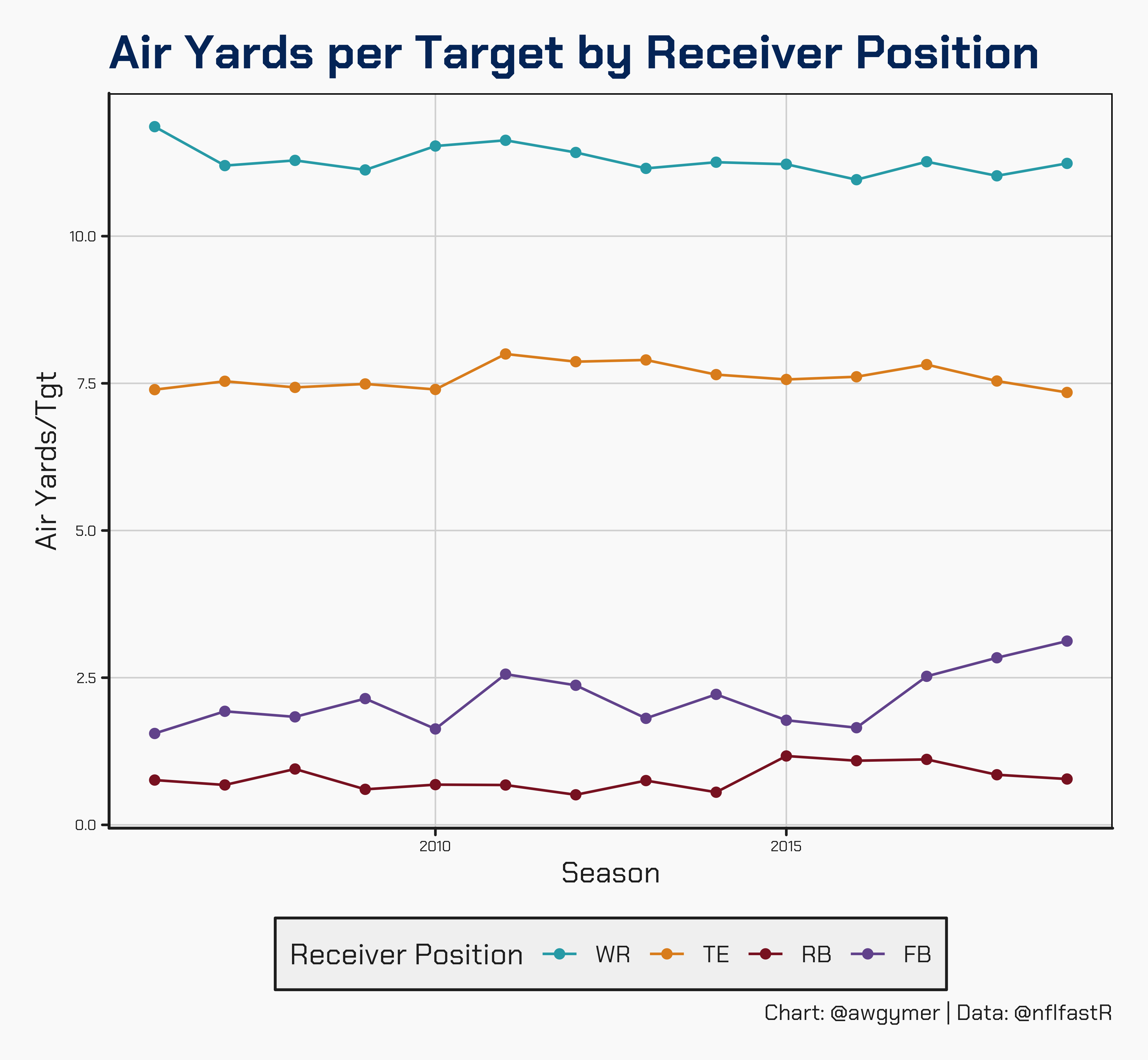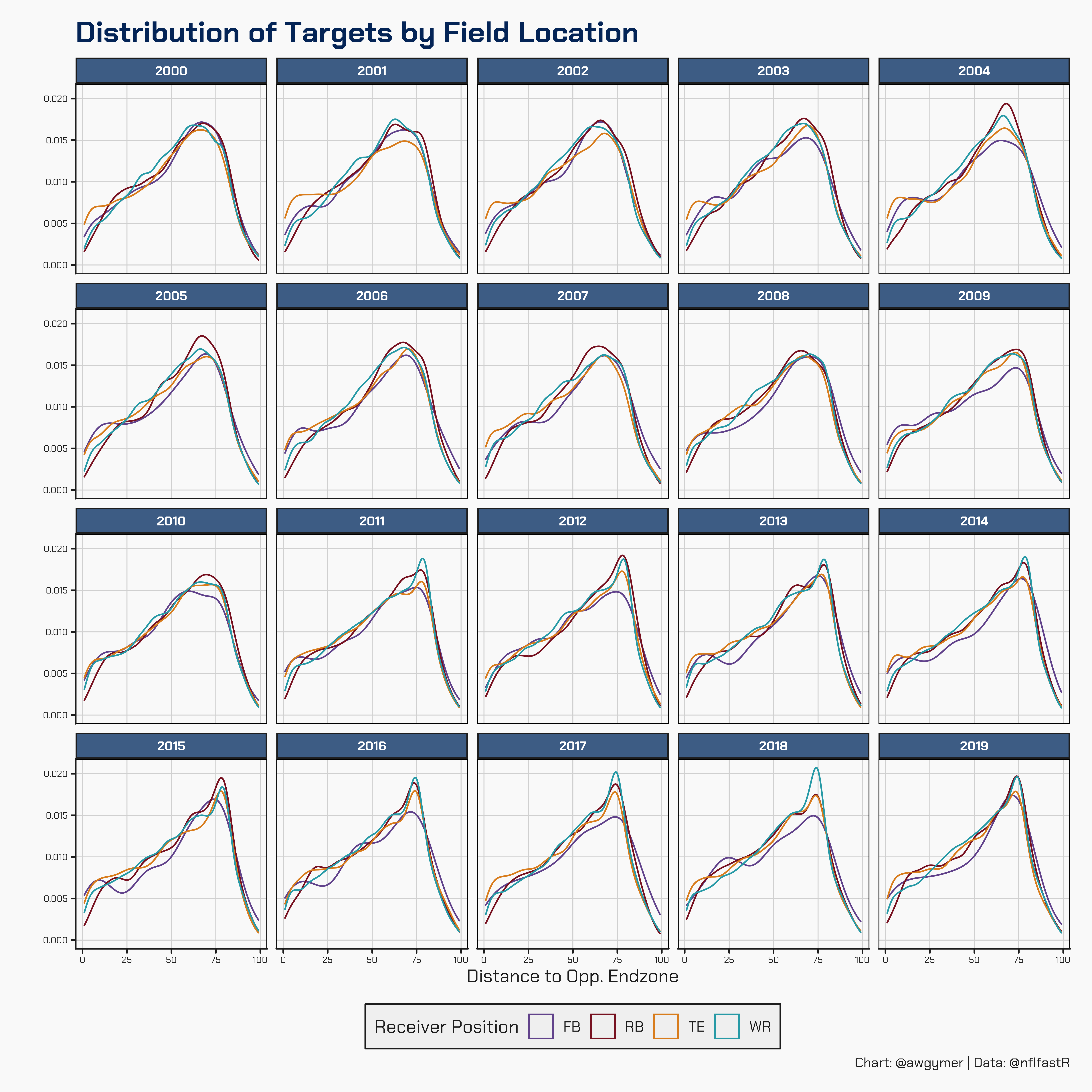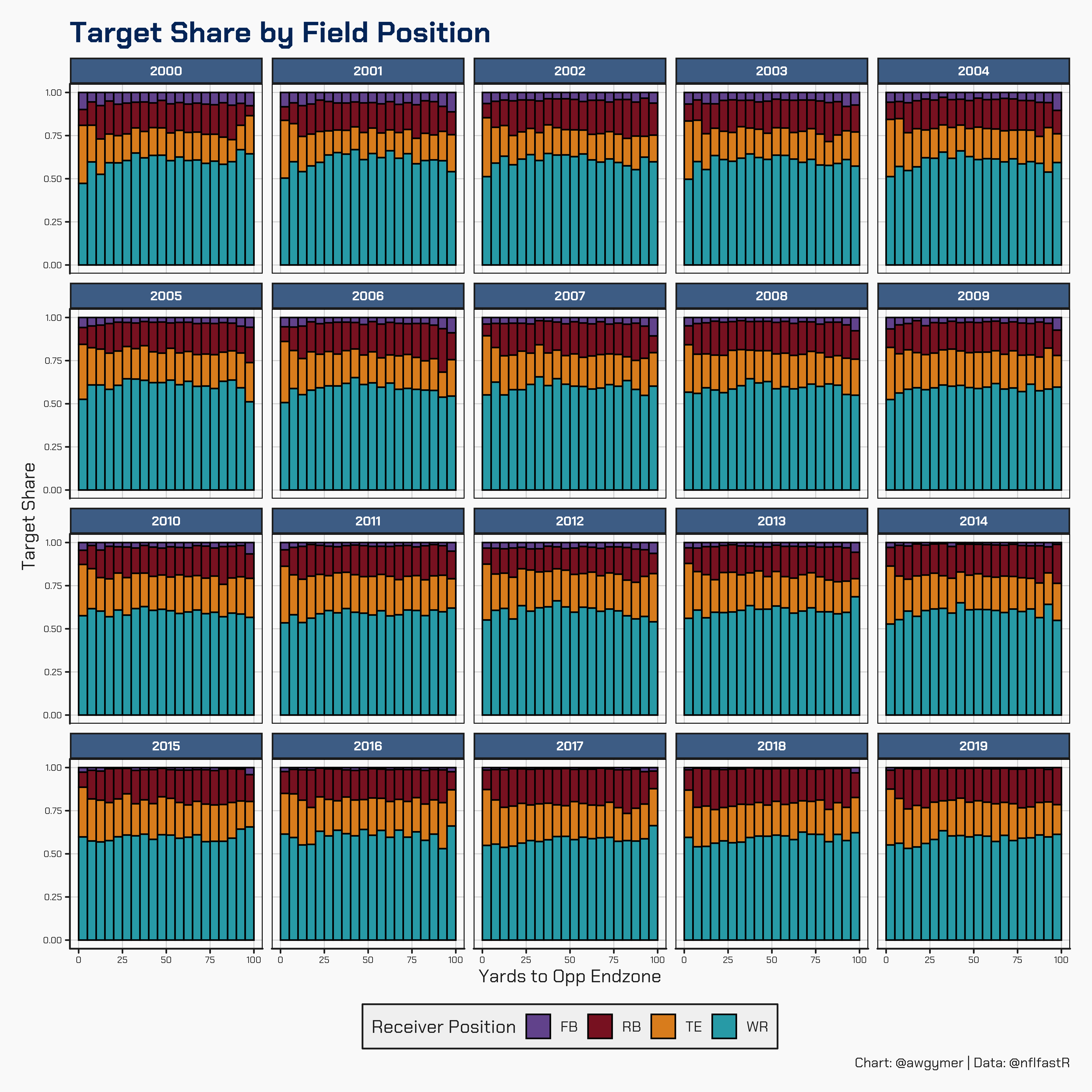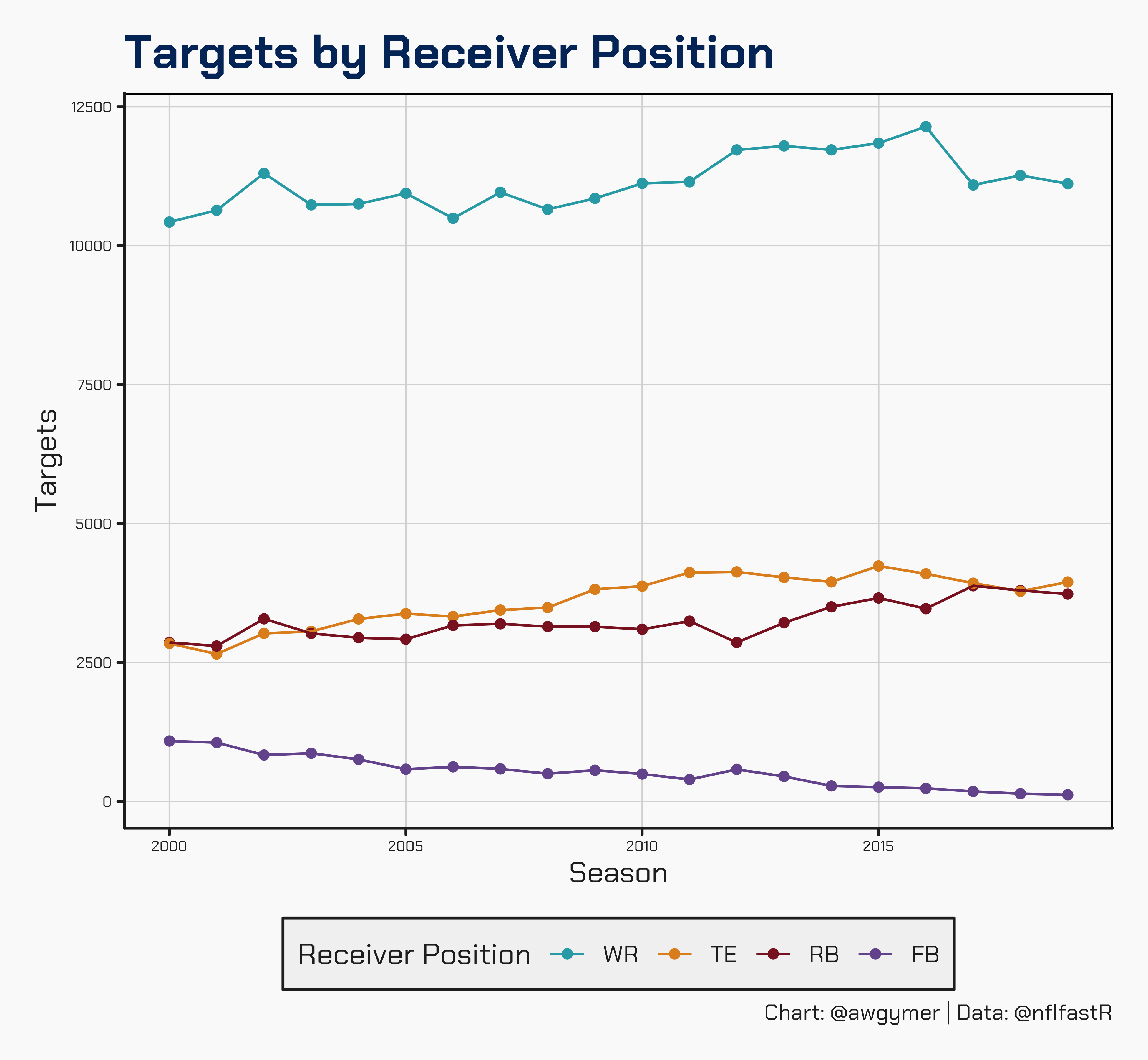 It looks like the last 20 years have seen a steady increase in targets for TEs and a large drop off in targets to fullbacks. There’s an interesting reduction in targets to WRs across the past 3 seasons after small rise over the previous decade and I don’t have a good explanation for that.