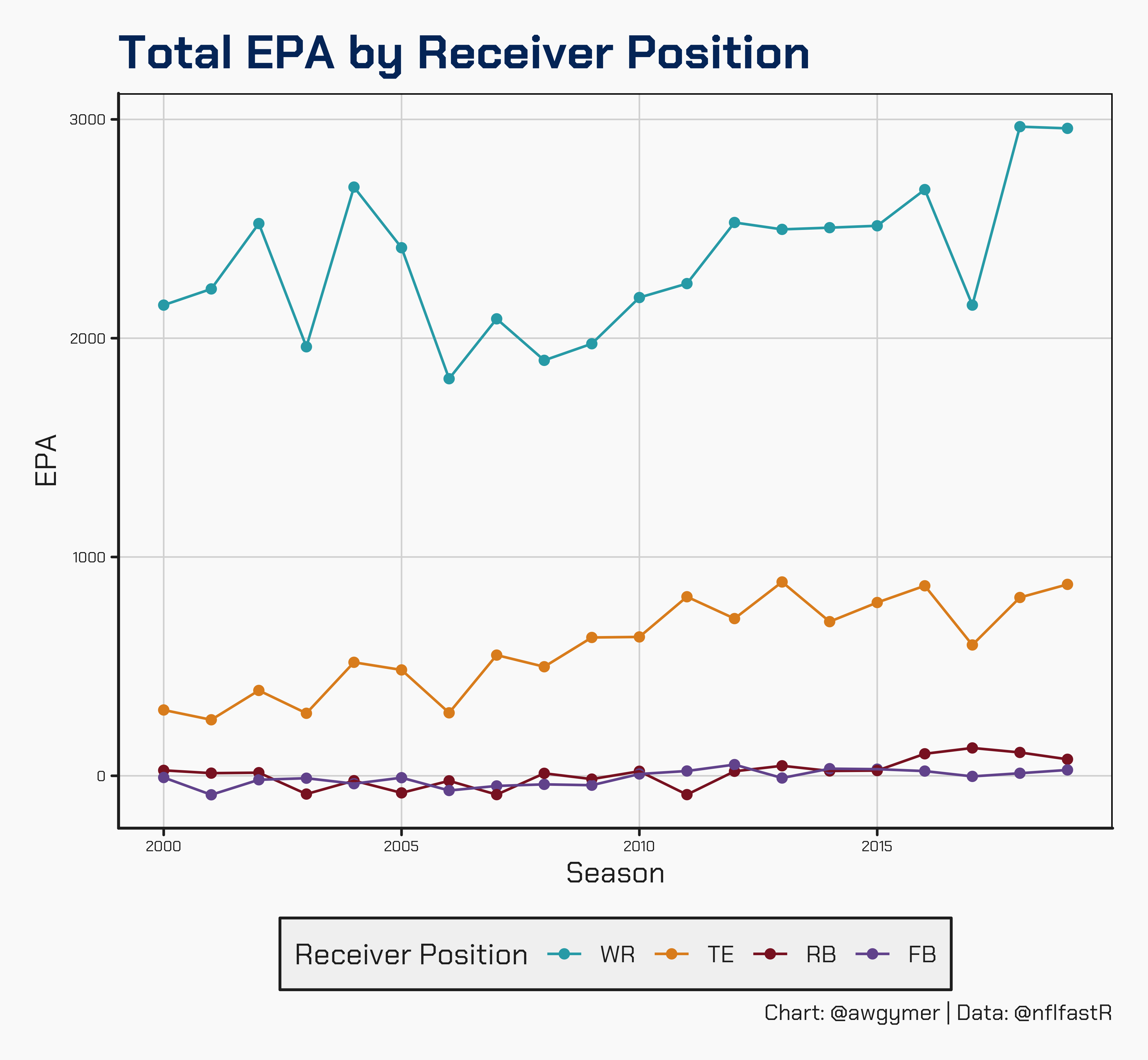 Looking at the total EPA accumulated by each position shows a similar rise for TEs and really highlights how using RBs in the passing game isn’t particularly effective; despite having similar numbers of targets to TEs their season-long EPA is next to nothing. Interestingly WR EPA in the past 2 seasons is at its highest despite the reduction in targets.