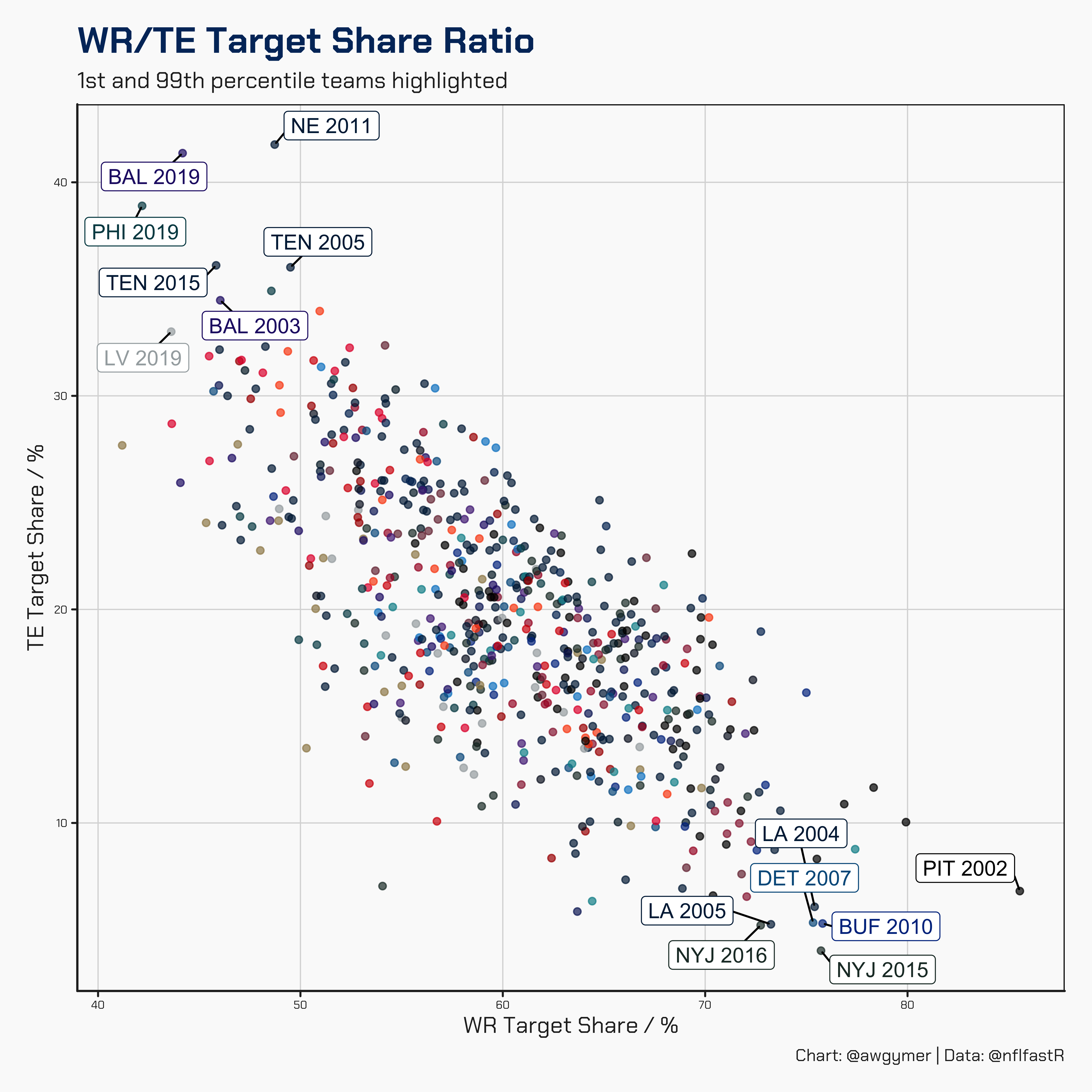 If we look at ratio of target-share for WR/TE there are a couple of teams which stand out, particularly those with high TE usage.
