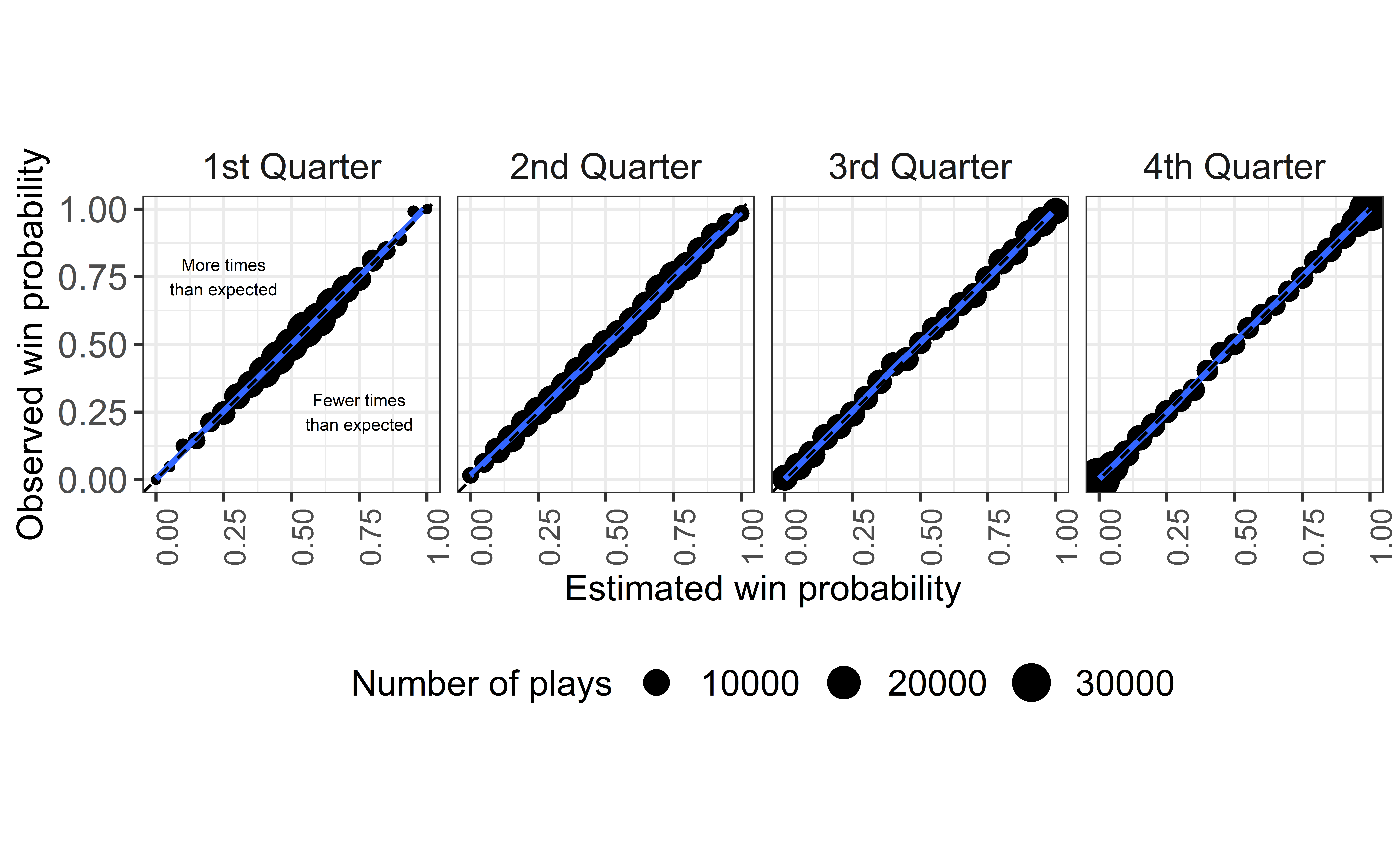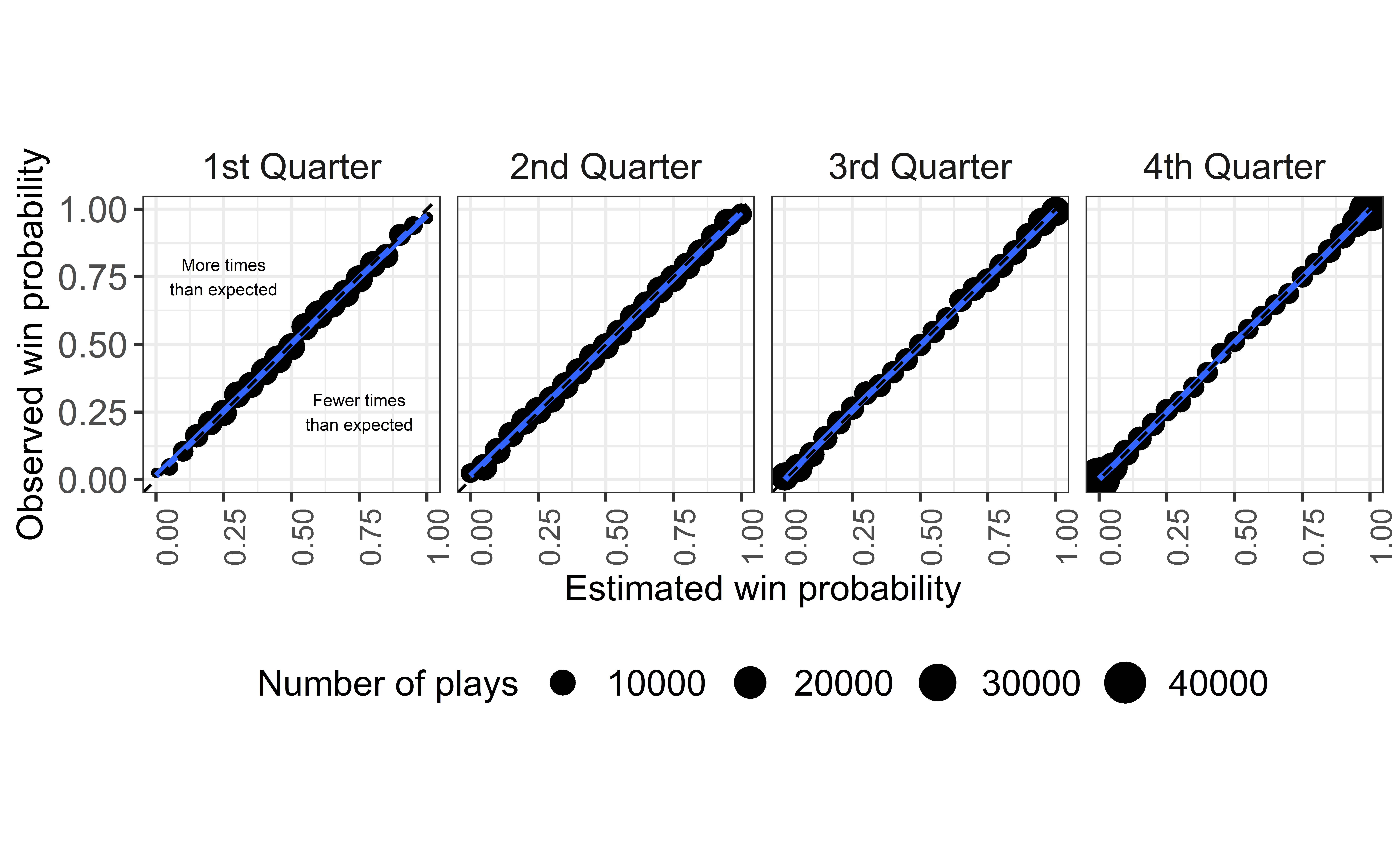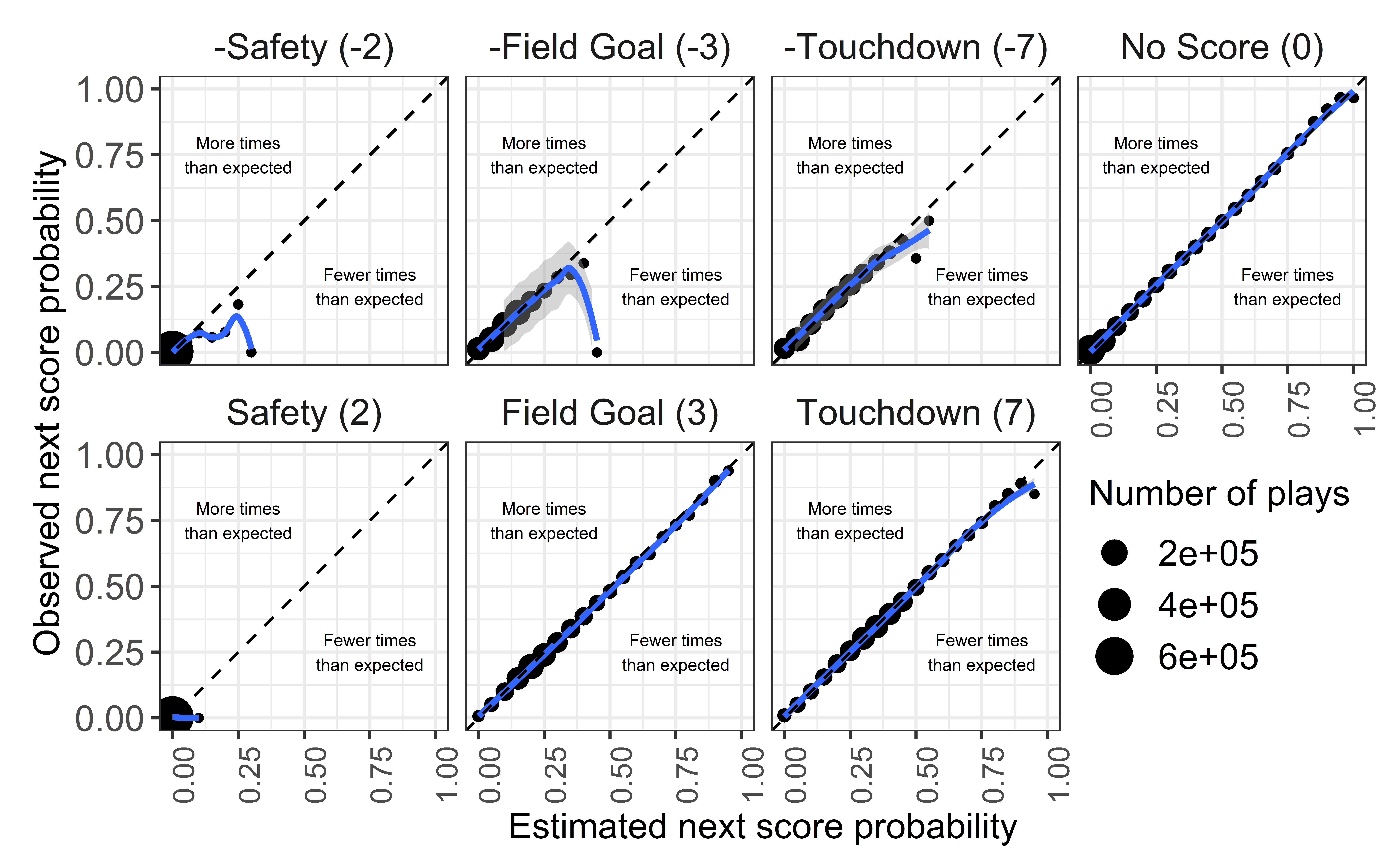 The goal of this section is to show that the nflfastR EP model is well calibrated. To measure calibration, we follow Yurko et al. and perform leave-one-season-out (LOSO) calibration. In particular, for each of the 20 available seasons (2000-2019), we exclude one season, train the EP model on the other 19 seasons, and then compare the model’s predictions in the holdout season to what actually happened in that season. If the model is well calibrated, we would expect that, for example, 50 percent of plays with a touchdown probability of 50 percent prior to the play would have the next score be a touchdown for the possession team.