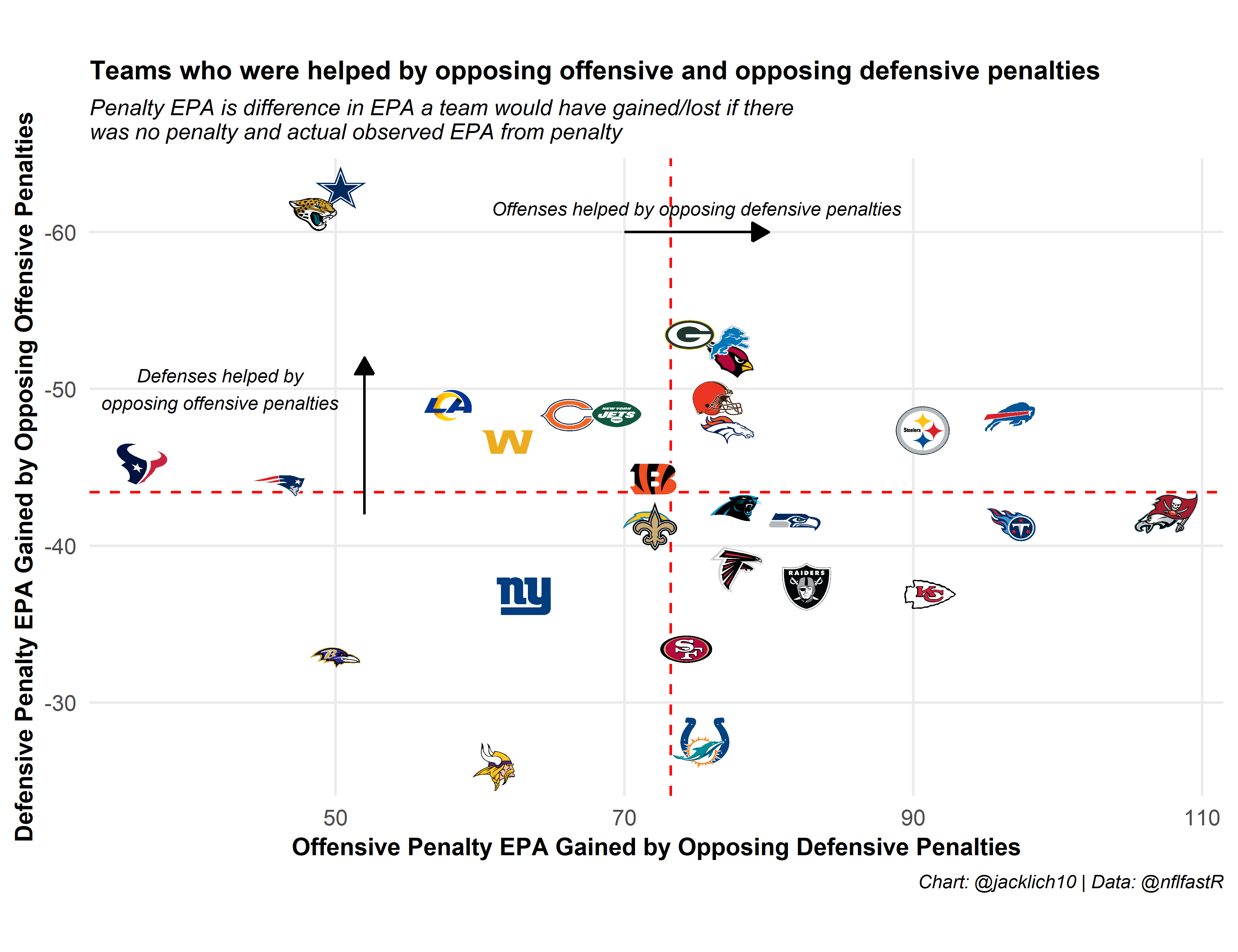 For fun, let’s examine the offenses that were helped most by opposing defensive penalties as well as defenses that were helped most by opposing offensive penalties in 2020. We see that Tampa Bay’s and Philadelphia’s offenses were helped out most by opposing defensive penalties while Dallas’ and Jacksonville’s defenses were helped by opposing offensive penalties.