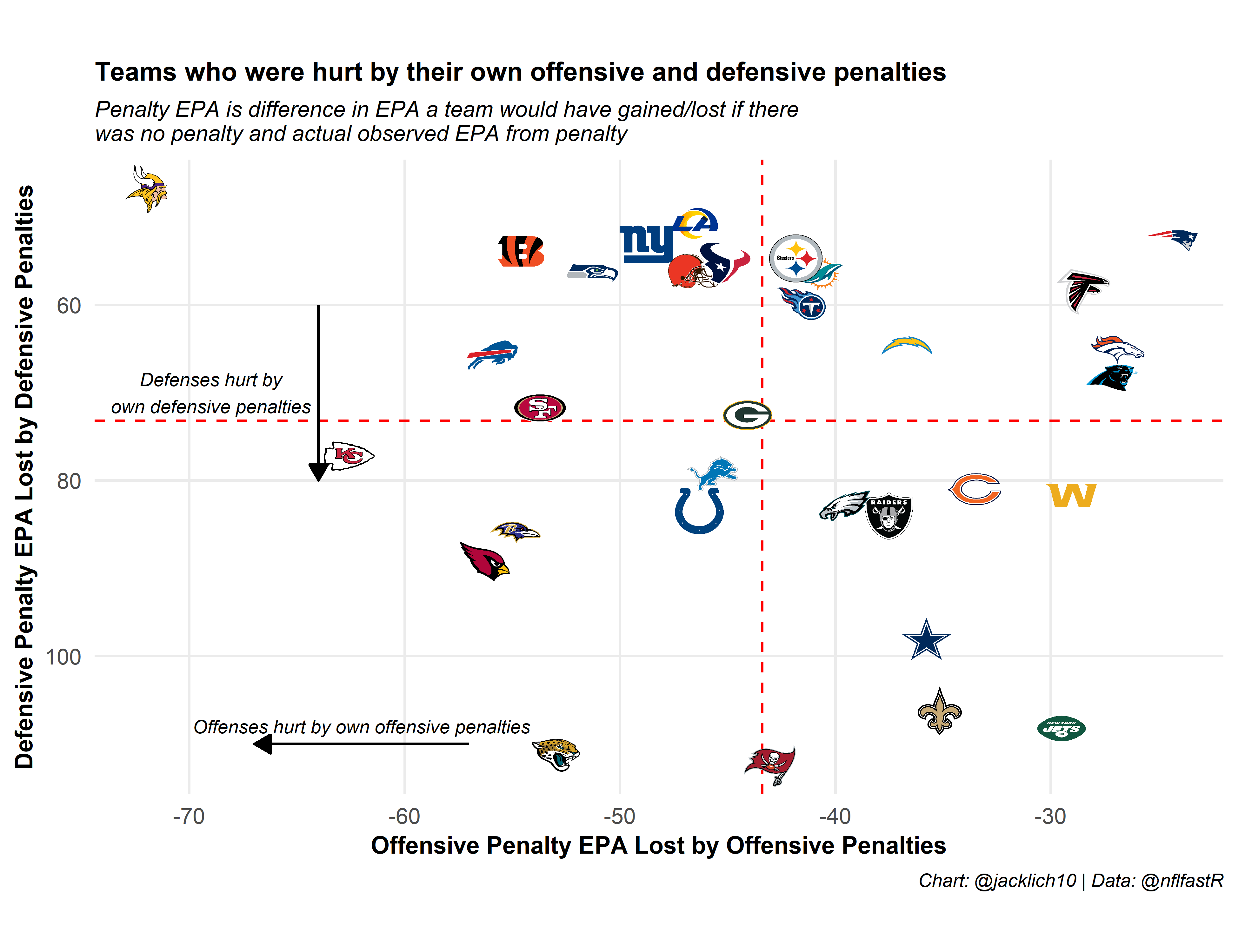 Note that for an offense like the Jets, while they lost a marginal amount of EPA from their own offensive penalties, this is primarily due to the fact that their penalties did not negate any explosive plays. This is in contrast to a team like the Patriots, who lost the least EPA from their own offensive and defensive penalties due to committing very few penalties in the first place.