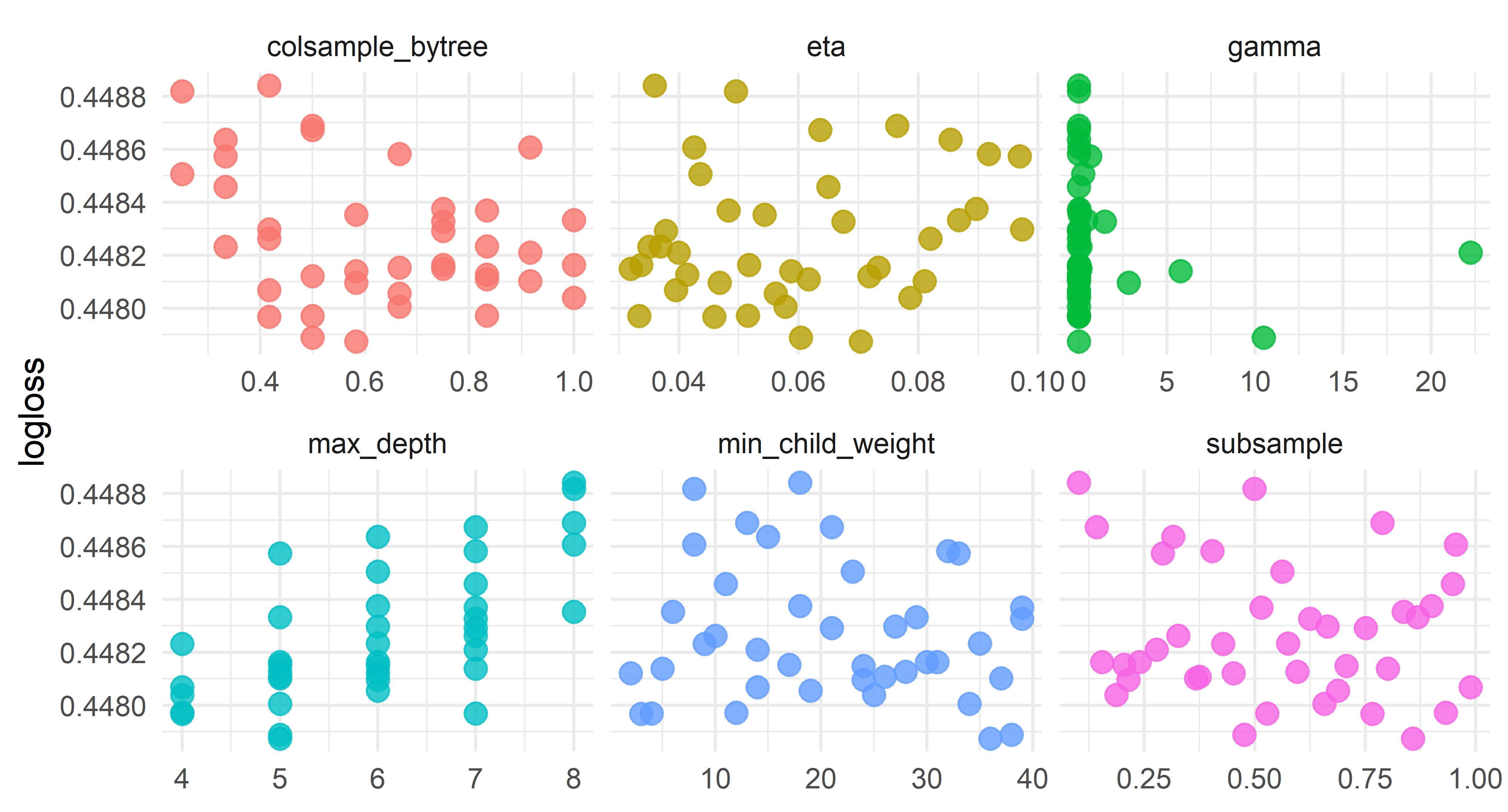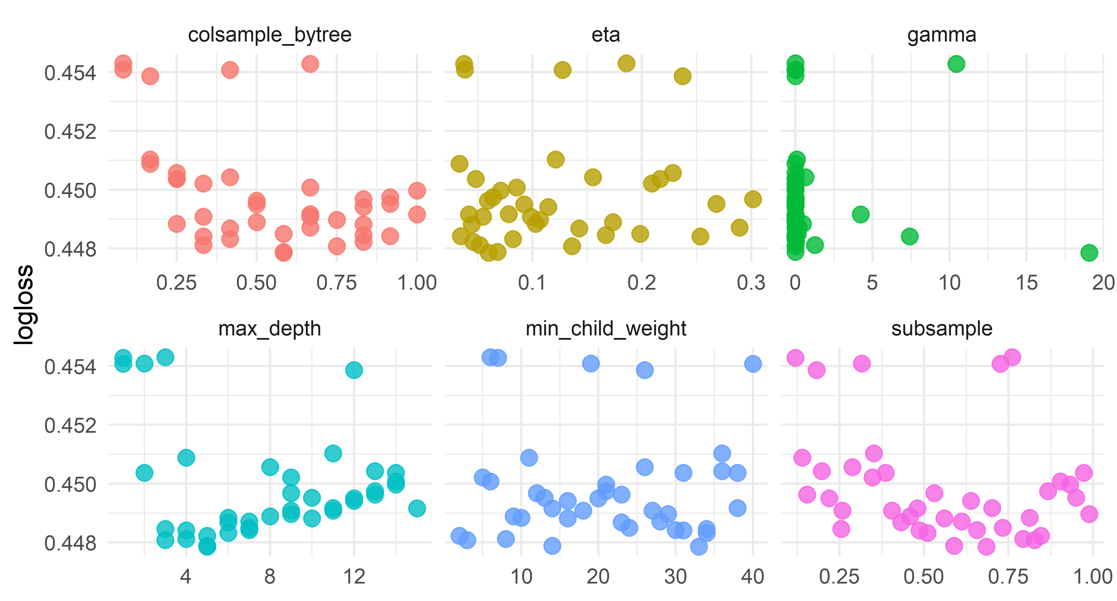 Let’s use dials to create a grid of hyperparameters to search over. This is one thing from tidymodels that I have found very useful, though note that it has different names for the hyperparameters than xgboost so there’s some renaming things at the end.