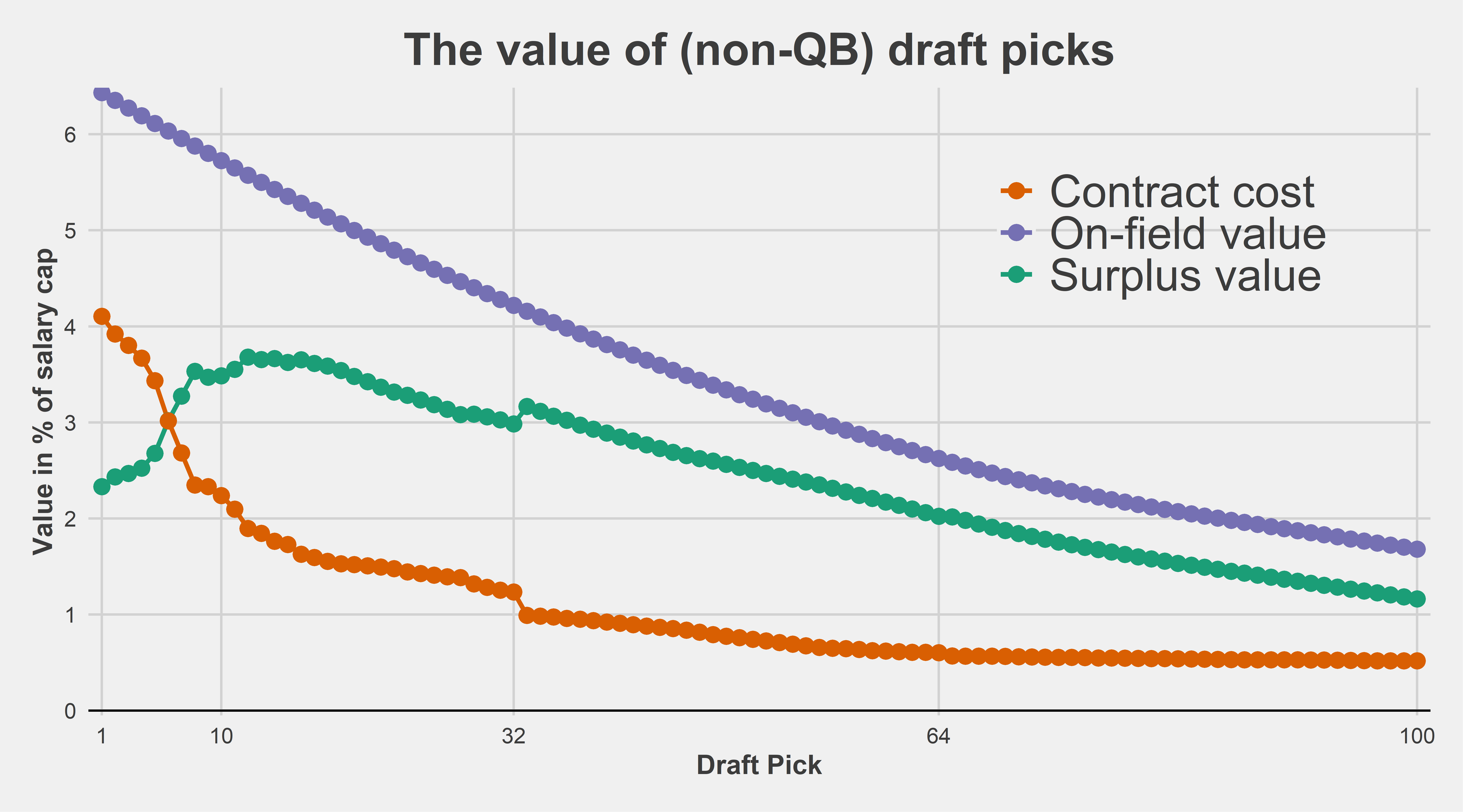 How to read the chart: the first pick in the draft costs 4.1% of the salary cap (orange line). The on-field production is expected to be 6.5% of the salary cap (purple line). Thus, the surplus value associated with the first pick in the draft is 2.4% of the salary cap (green line).