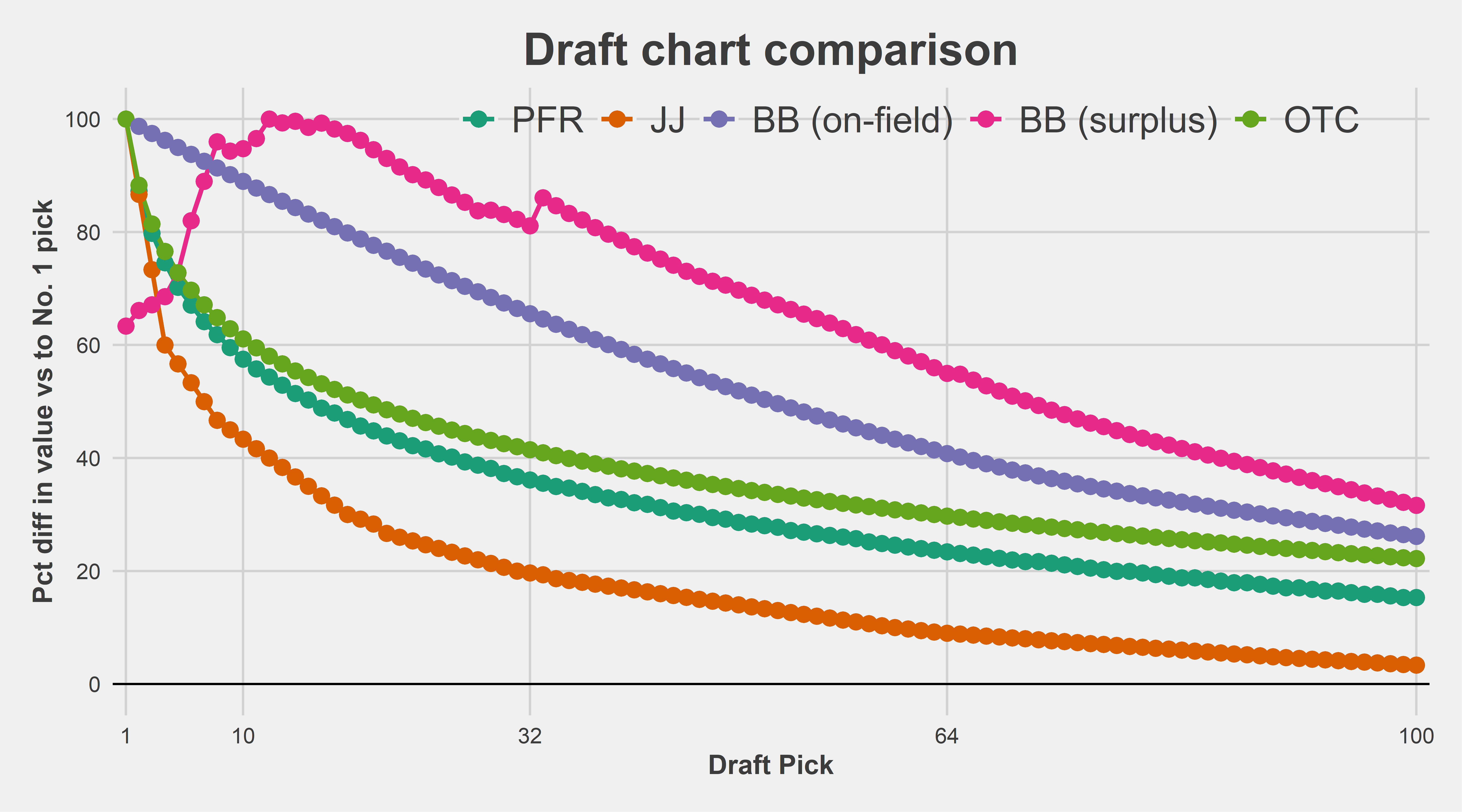 The three draft charts that I tend to see the most often are the OTC chart, the PFR chart made by Chase Stuart based on AV, and the original Jimmy Johnson chart. Here’s how they compare with the surplus and on-field values shown above.